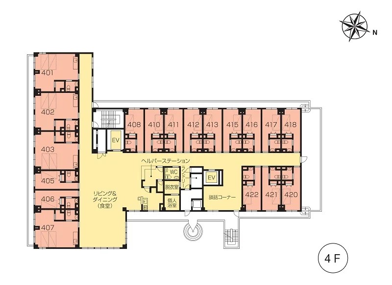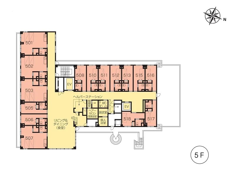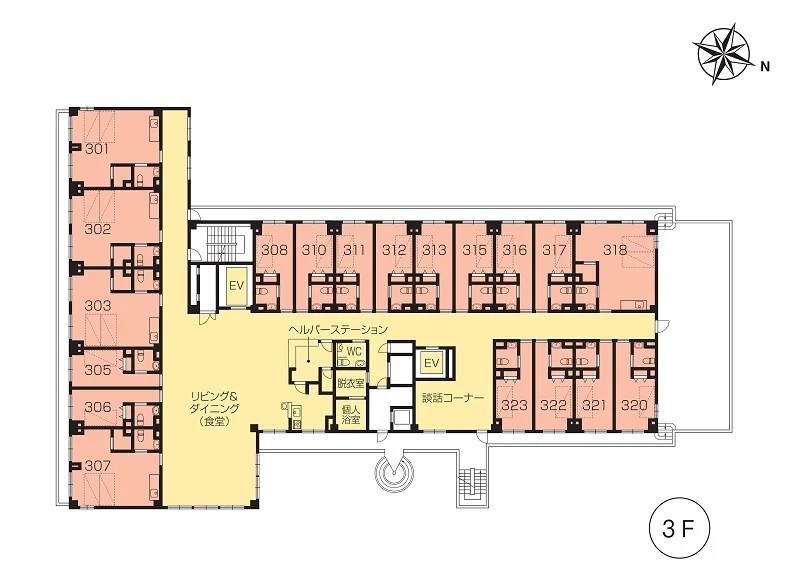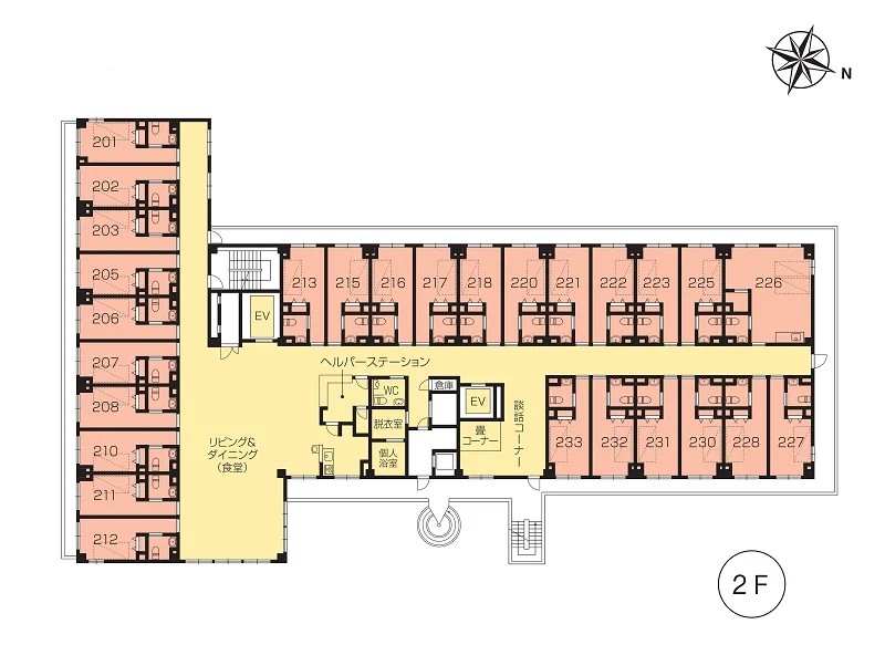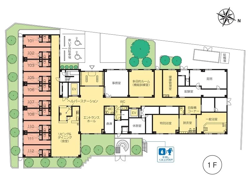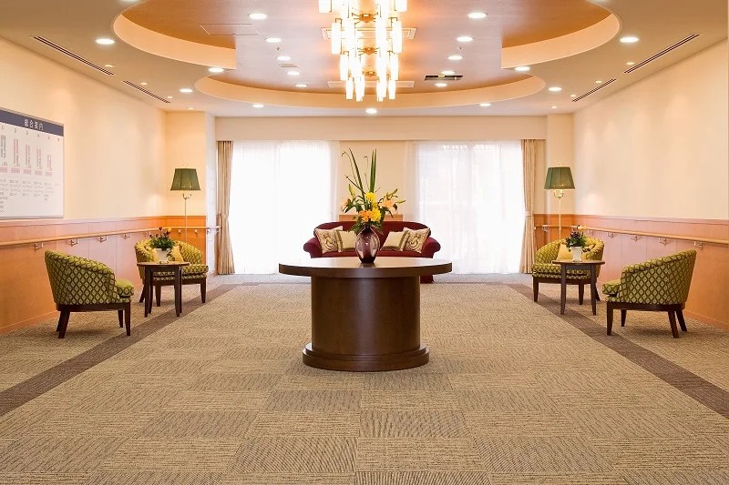 | 共用設備 | エントランスホール、リビング&ダイニング(食堂)※、多目的ルーム(機能訓練室)※、ヘルパーステーション、健康管理室、一般浴室、特別浴室、個人浴室、ヘアーサロン(理美容室)、ランドリー、化粧室、喫煙室、駐車場 ※食事だけでなくイベント・レクリエーション等、日常生活上多目的に使用。 ※機能訓練だけでなく多目的に使用。 |