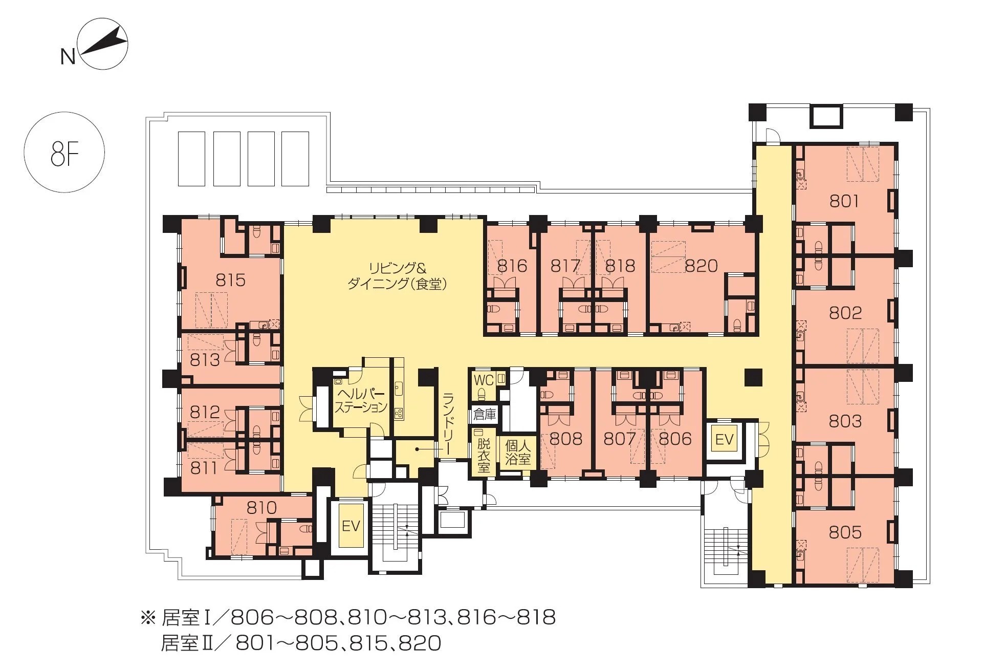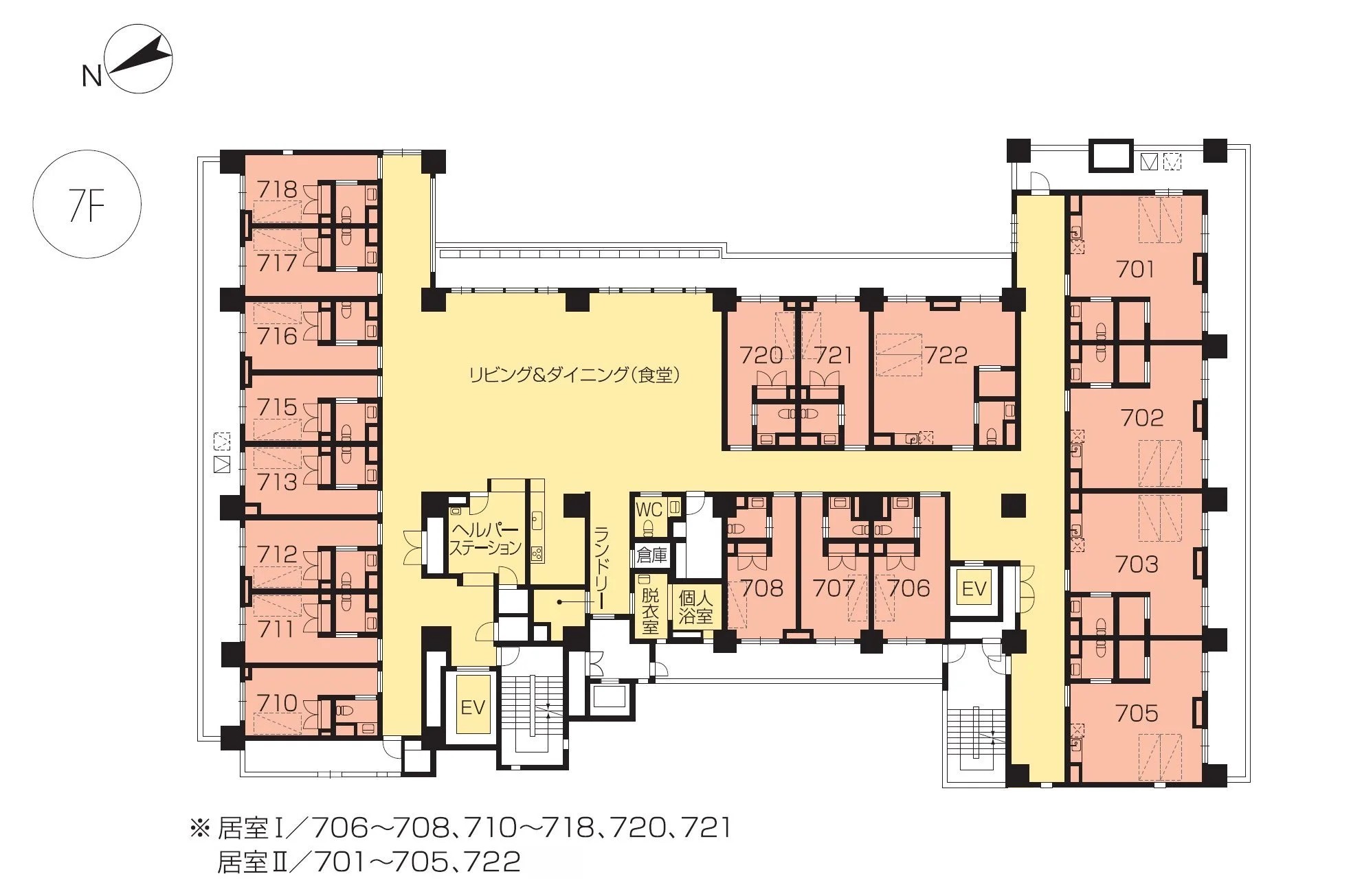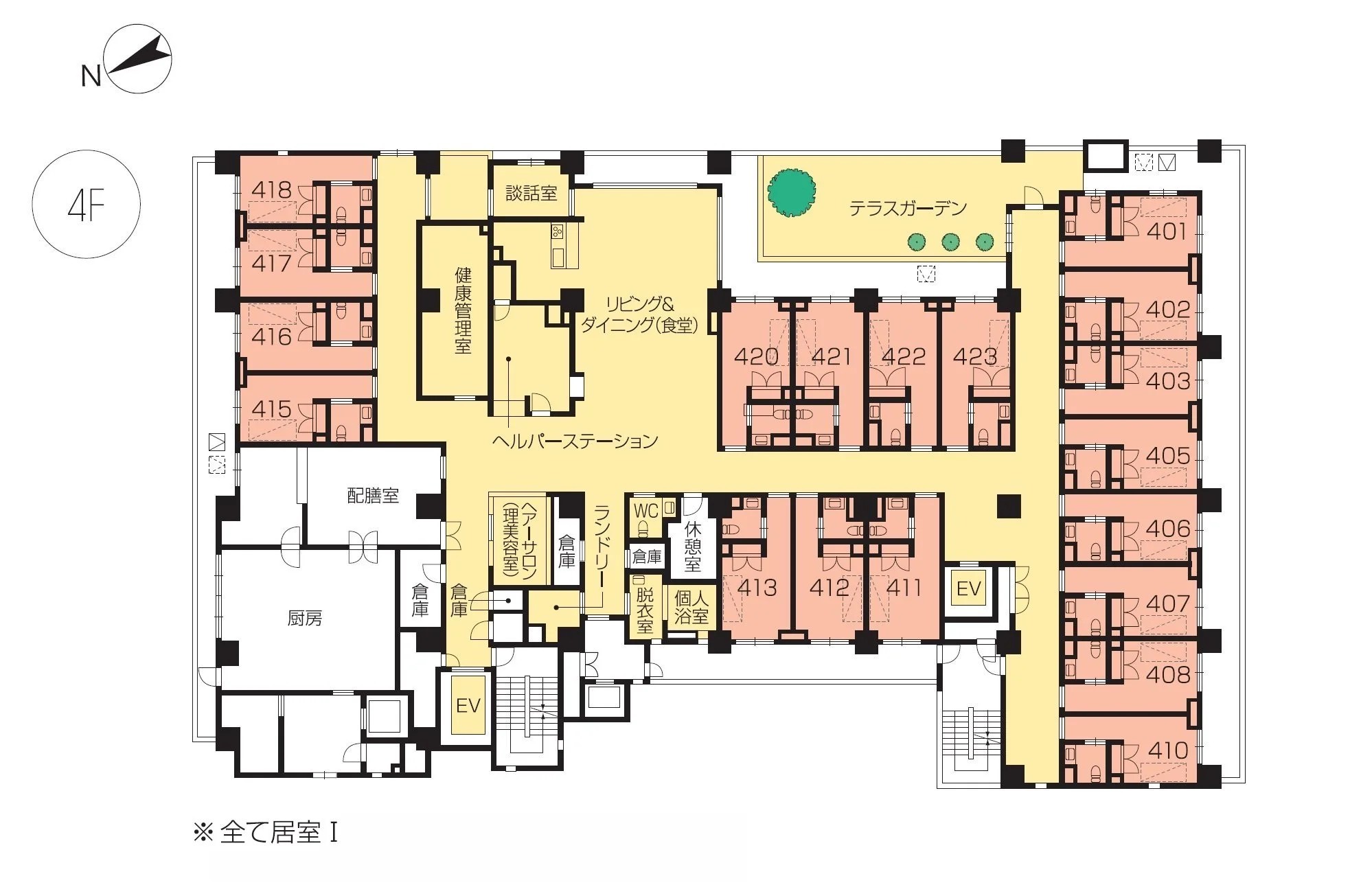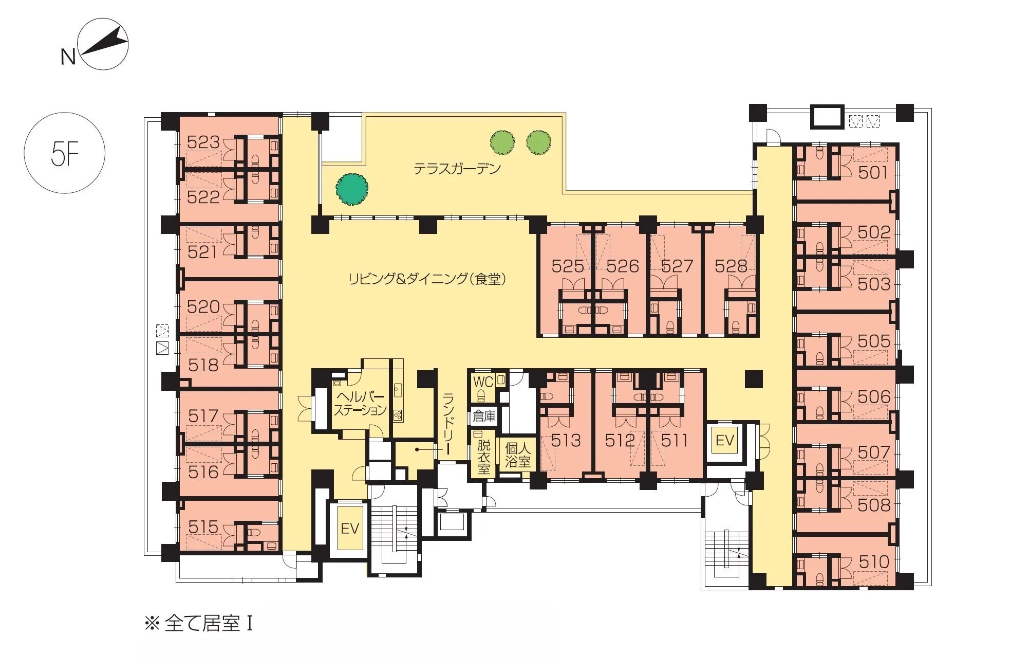 | 共用設備 | エントランスホール、リビング&ダイニング(食堂)※、談話室、応接室、ヘルパーステーション、健康管理室、一般浴室、特別浴室、個人浴室、テラスガーデン、ヘアーサロン(理美容室)、ランドリー、化粧室、喫煙室、駐車場 ※食事だけでなくイベント・レクリエーション・機能訓練等、日常生活上多目的に使用。 |