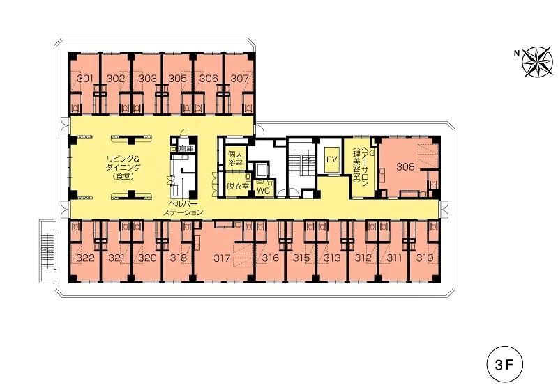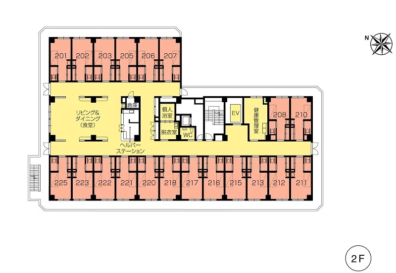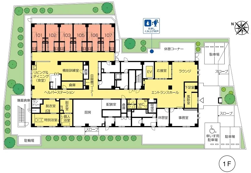 | 共用設備 | エントランスホール、リビング&ダイニング(食堂)※、機能訓練室※、ラウンジ、個人浴室、特別浴室、ヘルパーステーション、健康管理室、応接室、ファミリールーム、ヘアーサロン(理美容室)、ランドリー、喫煙室、駐車場 ※食事だけでなくイベント・レクリエーション等、日常生活上多目的に使用。 ※機能訓練だけでなく多目的に使用。 |