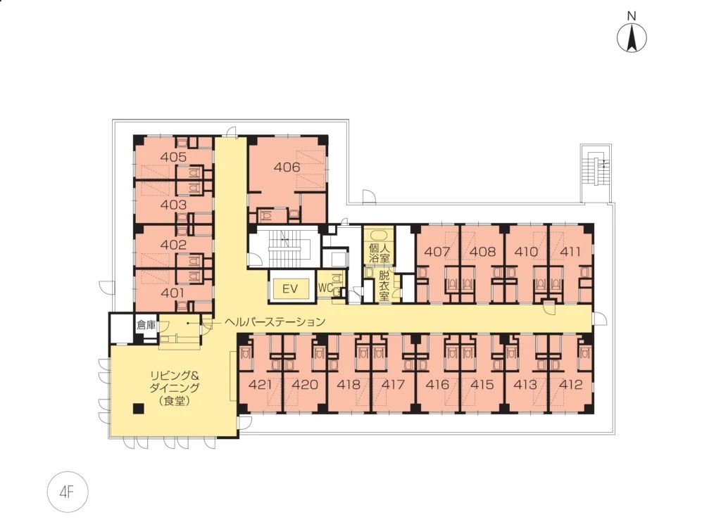 | 共用設備 | エントランスホール、リビング&ダイニング(食堂)※、機能訓練室※、ラウンジ、個人浴室、特別浴室、ヘルパーステーション、健康管理室、応接室、ファミリールーム、ヘアーサロン(理美容室)、ランドリー、喫煙室、駐車場 ※食事だけでなくイベント・レクリエーション等、日常生活上多目的に使用。 ※機能訓練だけでなく多目的に使用。 |