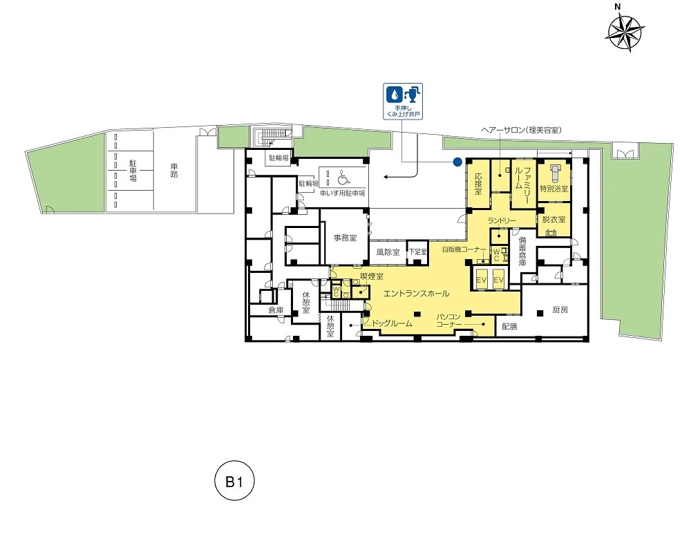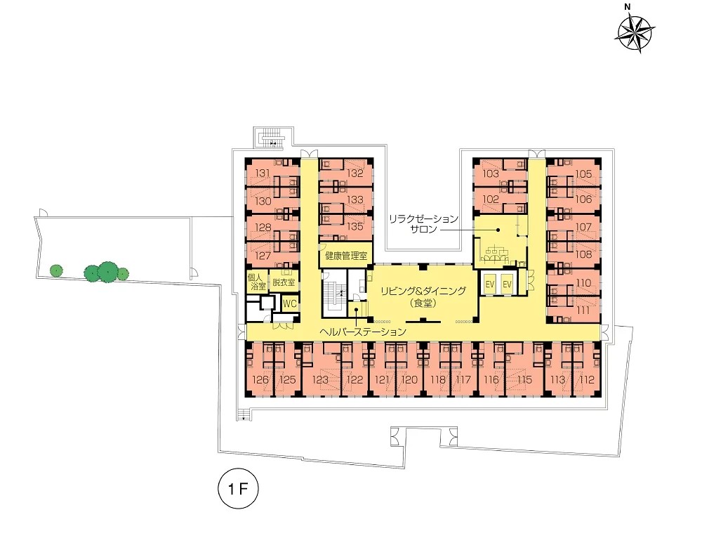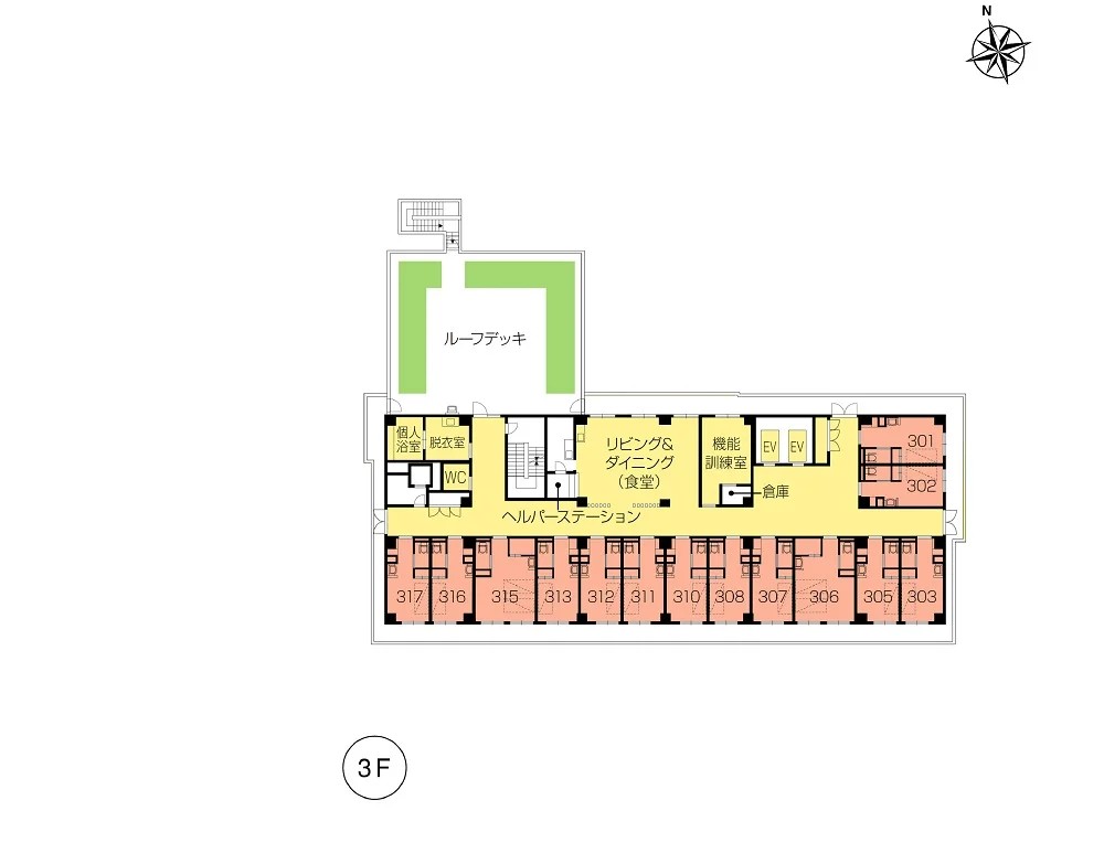 | 共用設備 | エントランスホール、リビング&ダイニング(食堂)※、機能訓練室、個人浴室、特別浴室、ヘルパーステーション、健康管理室、応接室、ファミリールーム、リラクゼーションサロン、パソコンコーナー、ヘアーサロン(理美容室)、ランドリー、喫煙室、ルーフデッキ、駐車場 ※食事だけでなくイベント・レクリエーション等、日常生活上多目的に使用。 |