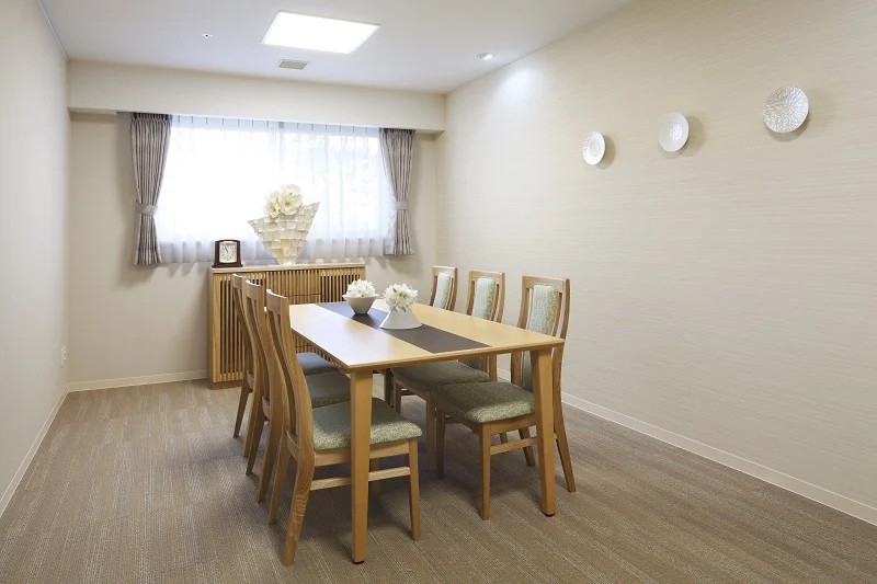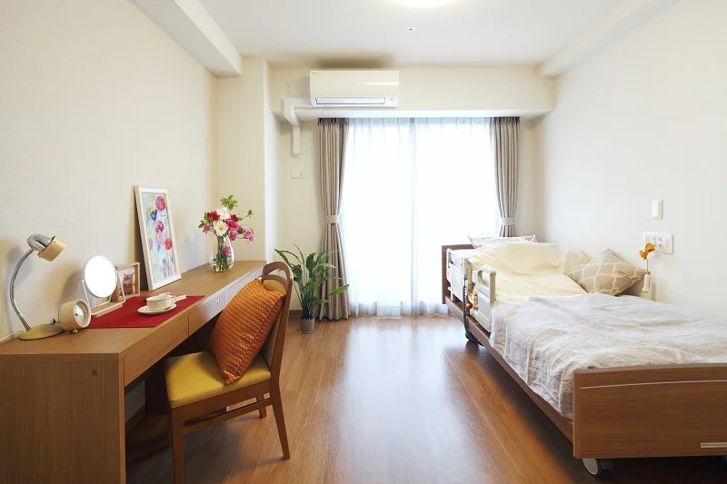 | 居室設備 | 介護用電動ベッド(寝具付)、ナースコール、車いす対応洗面台、温水洗浄機能付トイレ、チェスト、クローゼット、デスク、メモリーボックス、カーテン(レース・ドレープ)、エアコン |