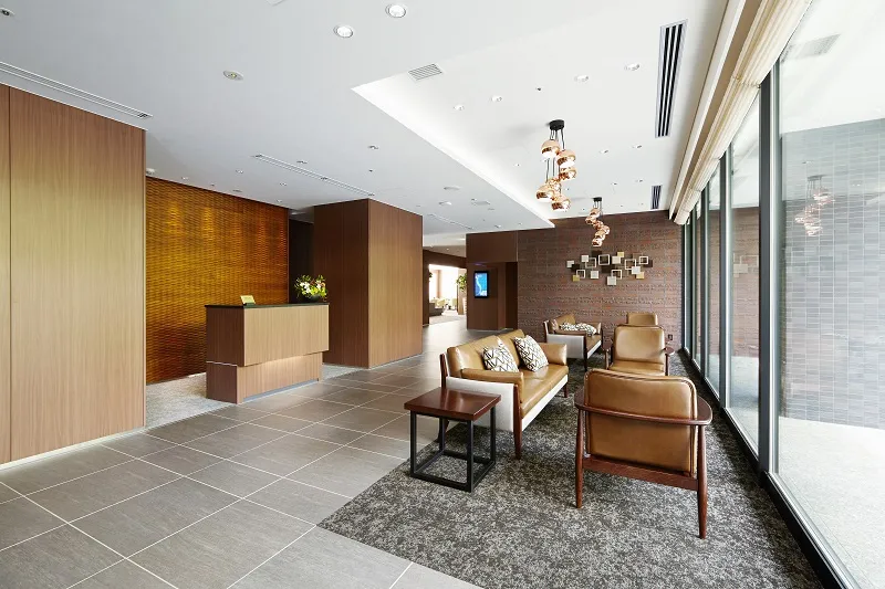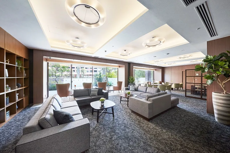 ご入居者とゲストをお迎えするスタイリッシュな空間のエントランスホール。お待ち合わせや送迎バスの待ち時間をお過ごしいただけます。フロントではスタッフがこまやかな心配りで、毎日の暮らしをサポートいたします。 ※フロント利用時間:9:00~17:00