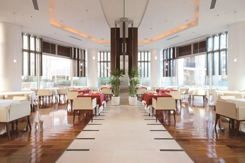 中庭を臨める広々とした空間が自慢のテラスレストラン。3食を予約不要で利用できます。毎食2種類のメニューから選択でき、アラカルトメニューも豊富です。各種ワインを取り揃えたワインセラーもあります。また、特別食もご用意しています。 ※食事、イベント食、特別食のご利用には別途費用がかかります。 ※イベント食、特別食は事前予約制です。