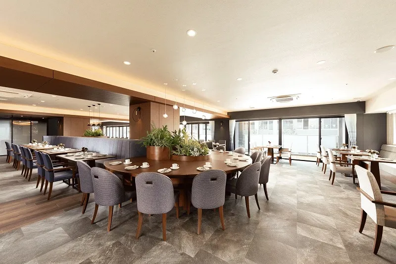陽光と木の味わいが調和する落ち着いた雰囲気。その時の気分に合わせてお食事ができるよう、様々なスタイルのテーブル・椅子をご用意しました。 ※食事、イベント食、特別食のご利用には別途費用がかかります。 ※一部食事、イベント食、特別食は事前予約制です。