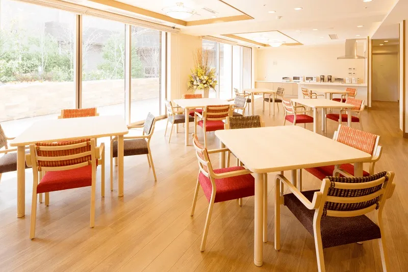 テラスに面した、陽光の差し込む明るい雰囲気のスペースです。お食事のほか、レクリエーションやご入居者同士での憩いの場としてご利用ください。 ※食事は有料です。