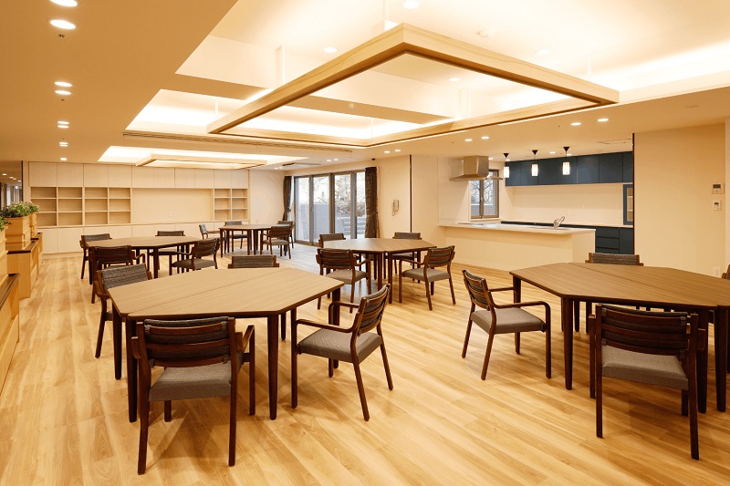 木目調であたたかな、明るい雰囲気のリビングダイニングです。お食事のほか、レクリエーションやご入居者同士での憩いの場としてご利用ください。 ※食事は有料です。