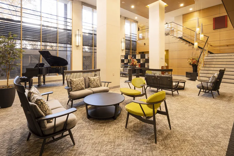 ご入居者やゲストをお迎えする吹き抜けの開放感あふれるエントランスは、思い思いに寛げるスペースです。コンサートなどのイベント会場としても使用されます。