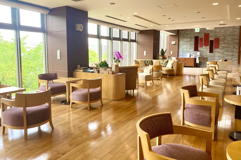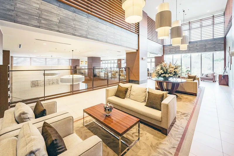 ご入居者・ゲストをお迎えする、2層吹き抜けの清々しいロビーラウンジ。奥には一面ガラス張りの大きな窓から、隣接する公園の木々を望むことができ、夏の新緑、秋の紅葉と四季の移ろいを感じられます。