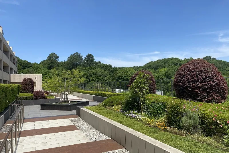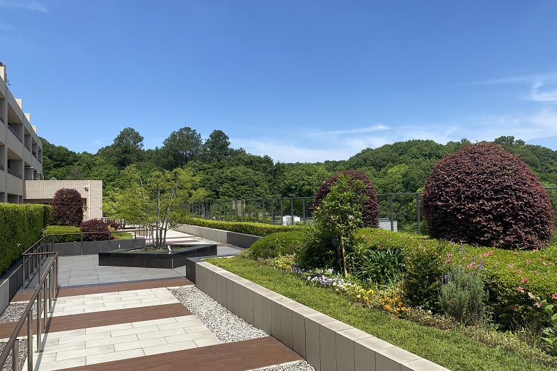 広々としたルーフガーデンはご入居者の憩いの場に。隣接する都筑中央公園の四季の彩りを近くに感じられます。天気の良い日はウォーキングや体操など健康づくりに取り組む姿も見られます。