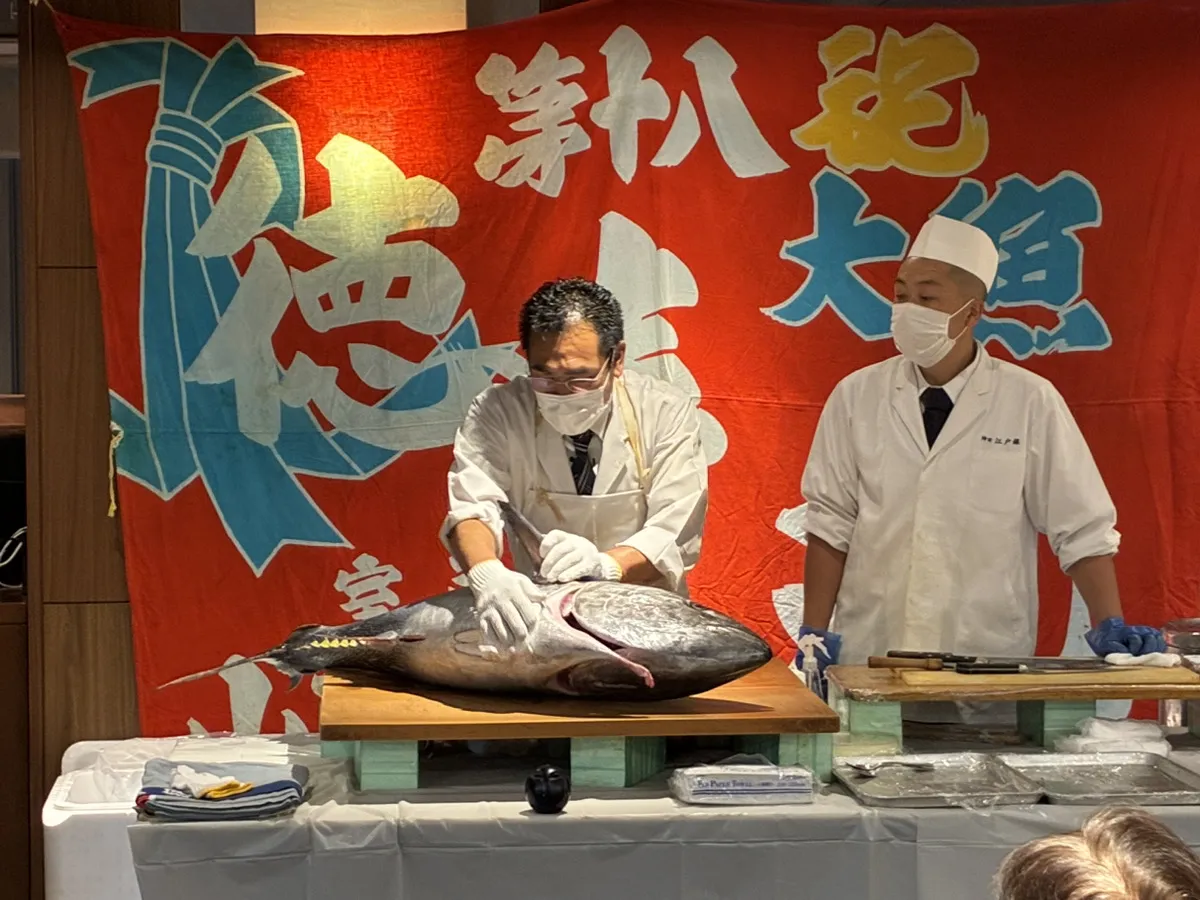 13周年イベント時にマグロ解体ショーを行いました。 各部位の説明をはじめ、食事もマグロ尽くしを満喫していただきました。