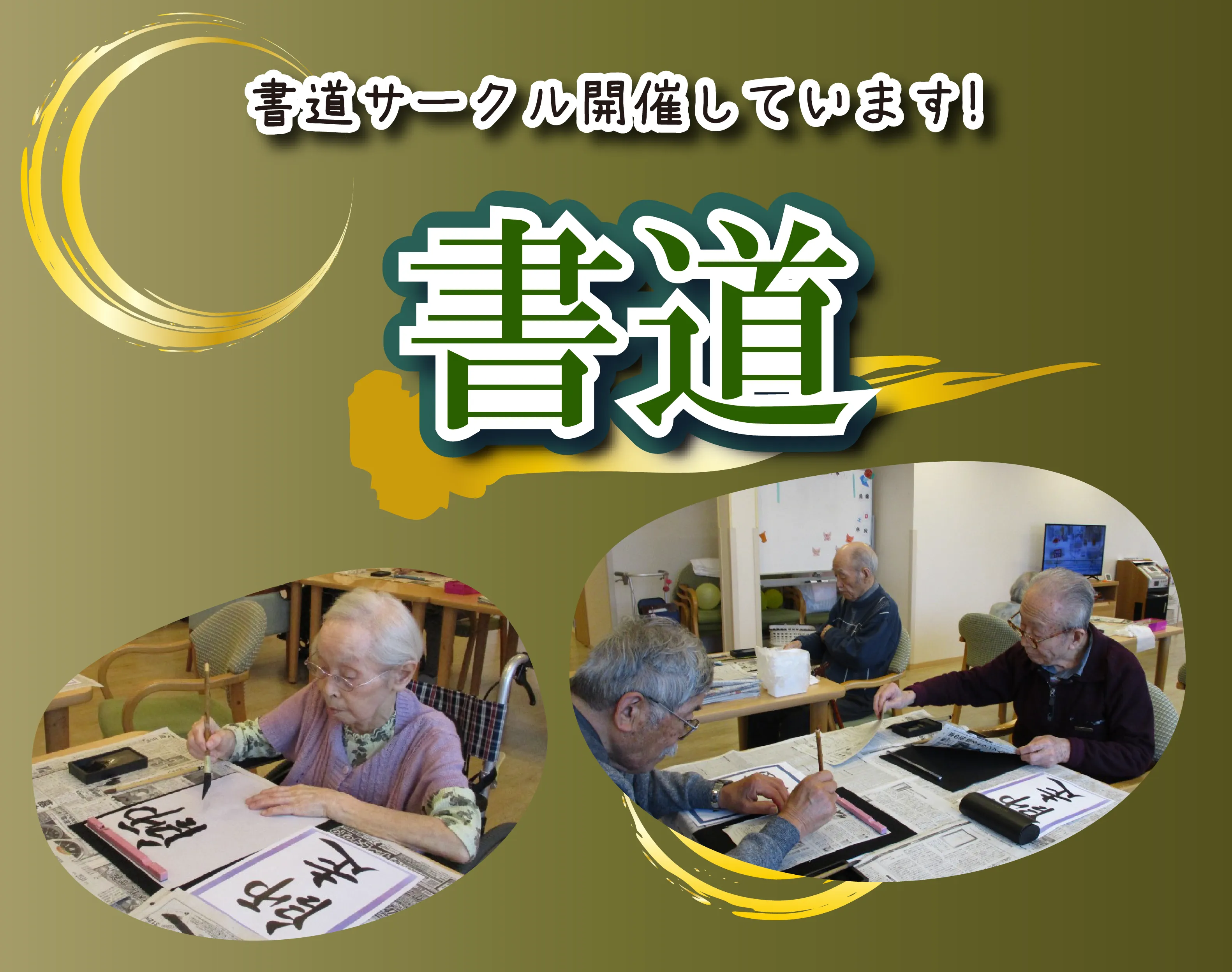 毎月開催されている書道サークルは男女問わず大人気。真剣な表情で無心に筆をはしらせ、納得の書には笑顔です。“書は心の鏡”といわれますが、作品はどれも個性豊かで、素晴らしいです。