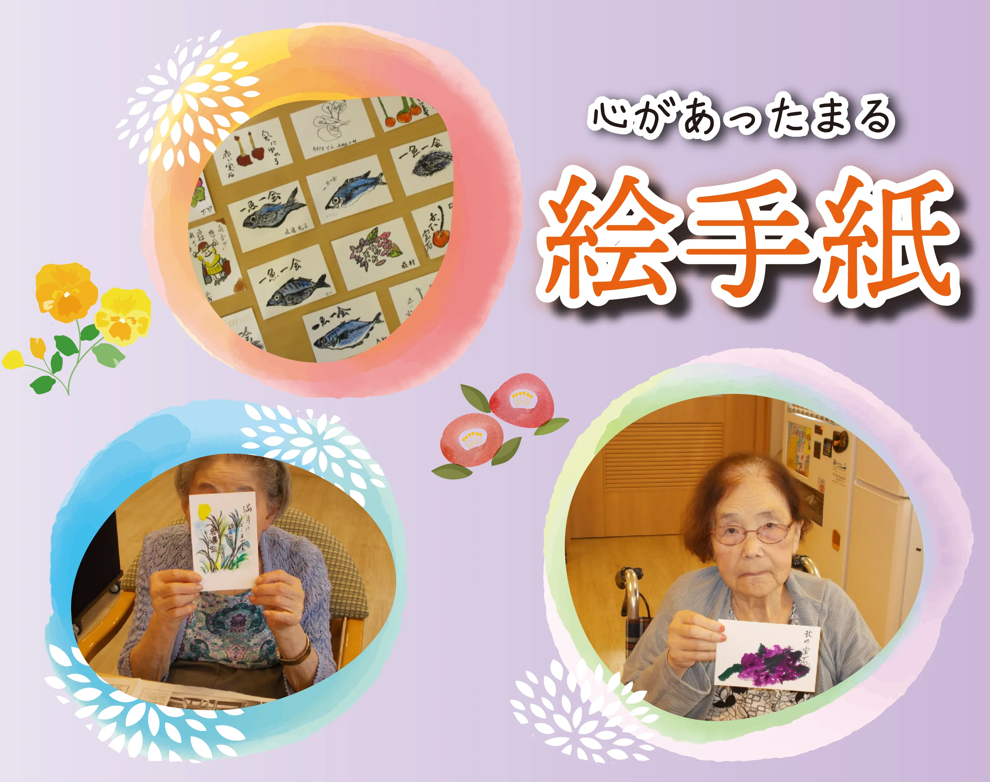 毎月開催されている絵手紙サークル活動。題材は、季節を感じて頂けるよう選択します。皆様の豊富な経験がものをいうのか味のある作品がたくさん。職員はいつもホッコリさせられてます。