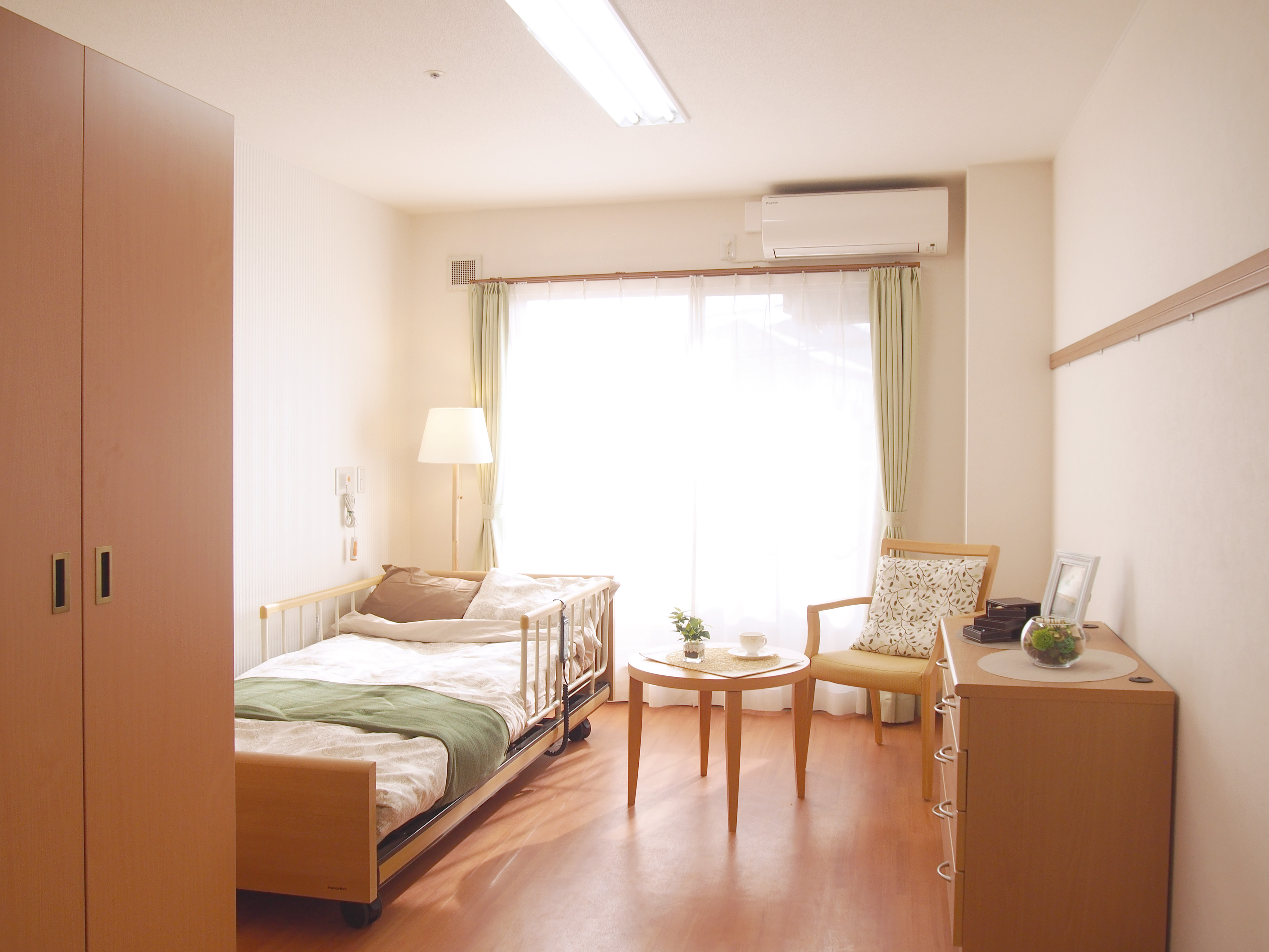 | 居室設備 | 緊急通報装置, テレビ回線, エアコン, クローゼット, 防災設備, 空調換気設備, 照明器具, カーテン, 寝具, 洗浄機能付トイレ(車いす対応・緊急コール付), 車椅子対応洗面化粧台, チェスト, 介護用電動介護ベッド |