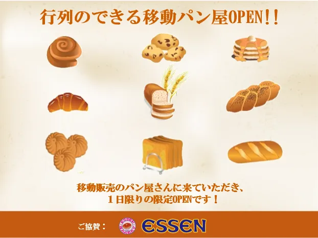 月に2回、移動パン屋さんの訪問があります。皆様楽しみにされており、販売日には毎回行列ができるほどの人気イベントです!どなたでも購入できますので、訪問日時など詳しくはお問合せください♪