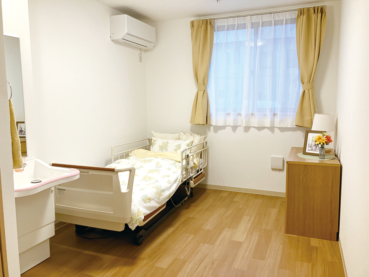 | 居室設備 | ALSOKセキュリティ, 緊急通報装置, テレビ回線, エアコン, クローゼット, 防災設備, 空調換気設備, 照明器具, 電動介護ベッド, カーテン, 寝具, 車椅子対応洗面化粧台(2居室共同設備), チェスト |