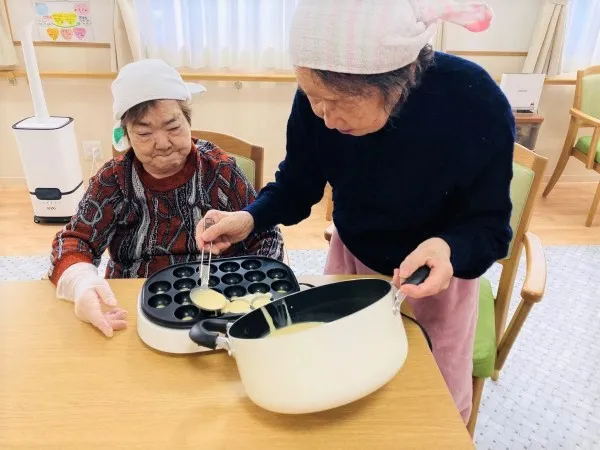 毎月1回ほどですが、おやつパーティーを開催します。ホットケーキ作りのため、食材を切り、混ぜて焼く!ご自身で作るので、おいしさもひとしおです♪