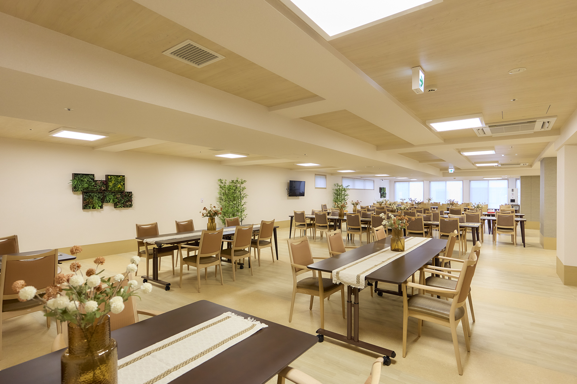 食堂は和モダンでゆったりとした空間になっており365日出来立ての温かい食事をリラックスして楽しんでいただけます。 お食事について、円樹いたばし四葉は、フード業日本一「ゼンショーホールディングス」の四本柱の一つである介護事業として、こだわりのメニューをご提供しております。 お食事は和食を中心にしながら洋食・中華もバランスよくご提供。イベント食としてすき家・はま寿司・ココスを運営するゼンショーグループのメニューをお楽しみいただけます。 てんぷらの日、ラーメンの日、季節イベントの日、ご当地の日等があります。 入居者様のお身体の状態に合わせて、きざみ食やソフト食、減塩食などのご用意もありますので、ご安心ください。