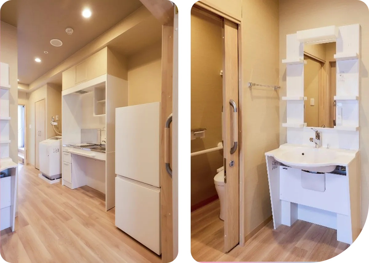 居室は全て個室で、キッチン・浴室付きです。内装や家具は和モダンなデザインを採用。家具は木や竹でできたものを選び、建具もご入居者様目線でこだわっています。 ナースコールは、スタッフの携帯に繋がるので夜間も安心です。