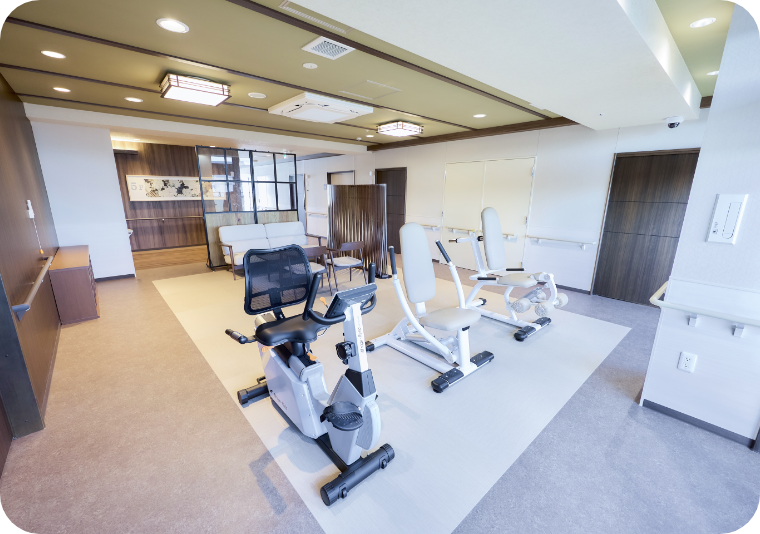 リハビリ室では、外出せずにご自由にリハビリができます。 さらに、24時間、職員が常駐して、安心・安全な生活のサポートをいたします。