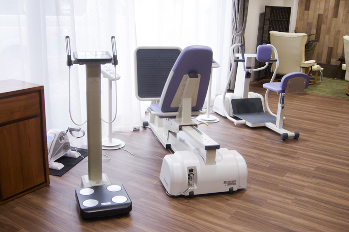 館内に併設されたデイサービスがお休みとなる毎週日曜日には、機能訓練機器を活用したリハビリを実施しています。レッグプレスやローイング、滑車運動、平行棒での歩行練習、階段昇降運動など、充実したトレーニング内容で身体機能の向上を支援します。
