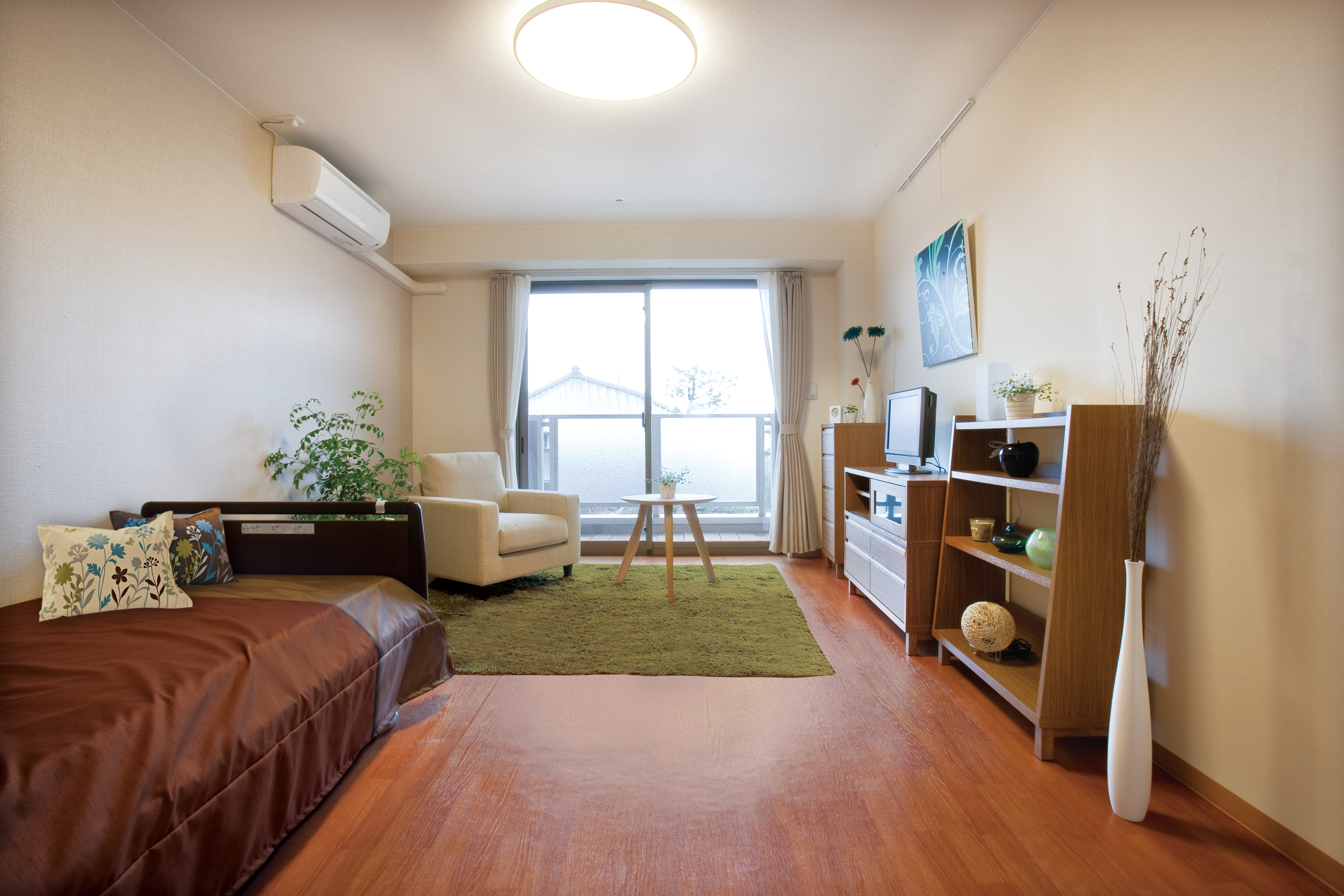 | 居室設備 | トイレ、エアコン、ナースコール、フローリング、人感センサー、化粧洗面台、地上波アンテナ、引き戸式ドア(居室内)、引き戸式ドア(玄関)、インターネット接続口、温水洗浄機能付きトイレ、照明器具、物干しベランダ、車椅子対応トイレ、鏡、防火カーテン、防災設備、電気給湯器、電話回線 |