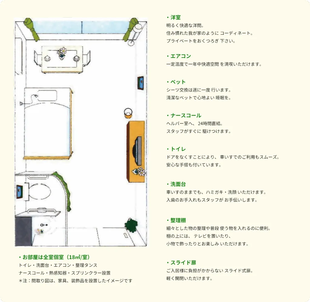 | 居室設備 | BSアンテナ、エアコン、トイレ、ナースコール、引き戸式ドア(玄関)、鏡、車椅子対応トイレ、車椅子対応洗面化粧台、収納棚、照明器具、寝具一式、地上波アンテナ、防災設備 |