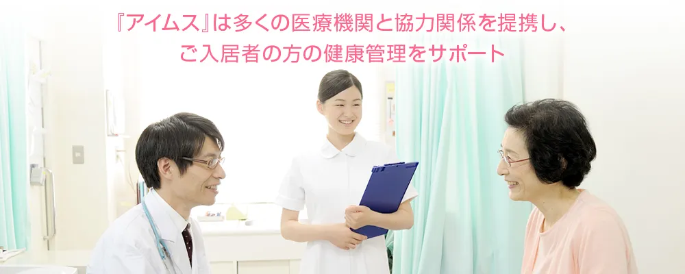 どんなに元気な方でも、年齢を重ねるにしたがって健康に不安を覚えるもの。介護付有料老人ホームとなれば、健康管理に対する期待や要望も大きく、それに応える信頼性の高いサポートが必要になってきます。 『アイムス赤羽』は、看護師が24時間常駐し、多数の医療機関と協力関係を提携、ご入居者の方の健康管理を支援しています。 医師による定期的な診察・健康相談から、協力医療機関による各種診療や治療まで、ご家族の方にとっても安心してお任せいただける充実の体制が整っています。