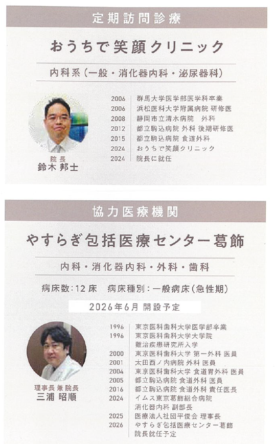 医療法人社団平俊会「やすらぎ包括医療センター葛飾」との緊密な医療連携により、“介護施設で完結する医療ケア”を実現します。医師による定期訪問診療·緊急往診·入院受入体制が整っており、がん·難病·慢性疾患·急変時対応まで一貫した医療サポートが可能です。「医療と介護が途切れない安心」をご家族にも提供いたします。