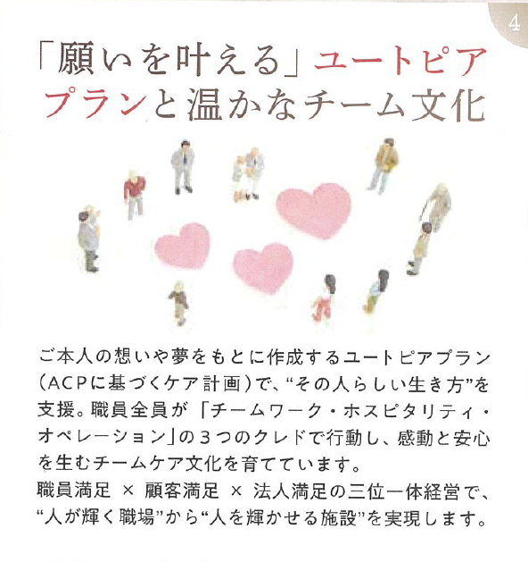 ご本人の想いや夢をもとに作成するユートピアプラン(ACPに基づくケア計画)で、“その人らしい生き方”を支援。職員全員が「チームワーク·ホスピタリティ·オペレーション」の3つのクレドで行動し、感動と安心を生むチームケア文化を育てています。 職員満足 ×顧客満足 ×法人満足の三位一体経営で、“人が輝く職場”から“人を輝かせる施設"を実現します。