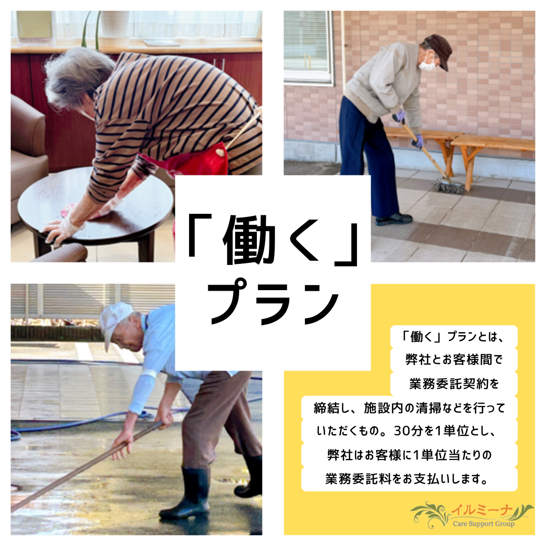 イルミーナおおみやでは「働く」プランを実施しています。 実際にご入居者様が住宅内で働いています。 いくつになっても「働きたい」! 身体はまだまだ元気だから、身体を動かしながら「働きたい」! そんな皆様をイルミーナおおみやはお待ちしております。