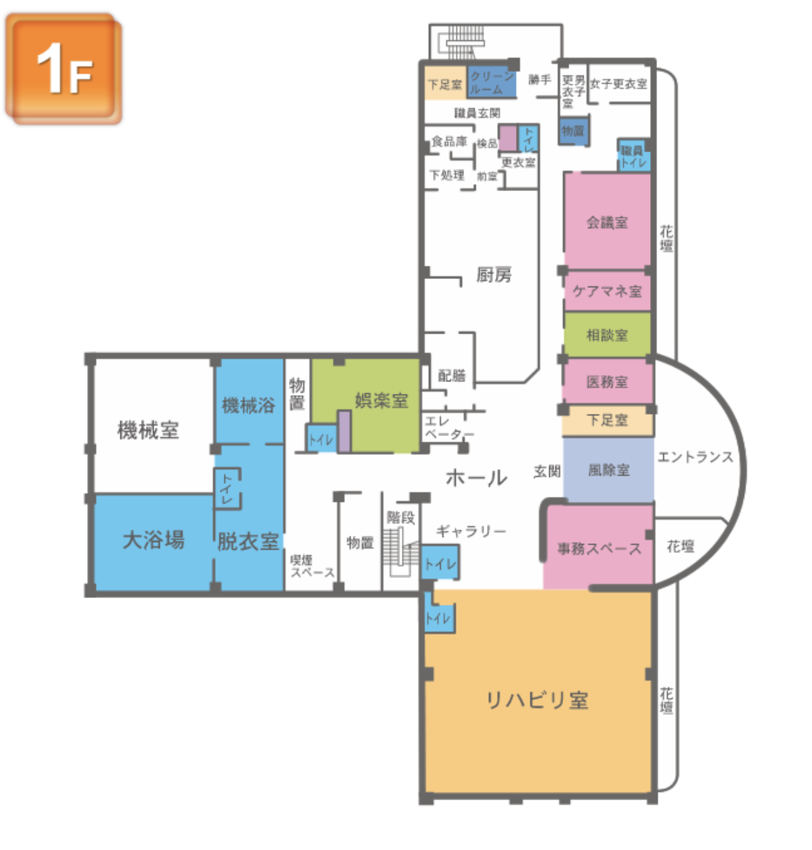 機能訓練指導員が計画するリハビリ計画に基づき機能訓練を実施しています。単に機能訓練を行うだけでなく「生きるから暮らすへ」をテーマに「リハビリテーション概念を取り入れた生活の中におけるリハビリ」や「生活リズムづくりを含めた、入居者様の尊厳のある生活」などを目標にしております。 リハビリにおいては、1Fのリハビリ室はじめプライベートを重視した居室やお食事のできる広いホールそして館外での散歩を通した歩行訓練など取り組む際の環境にも配慮をしております。