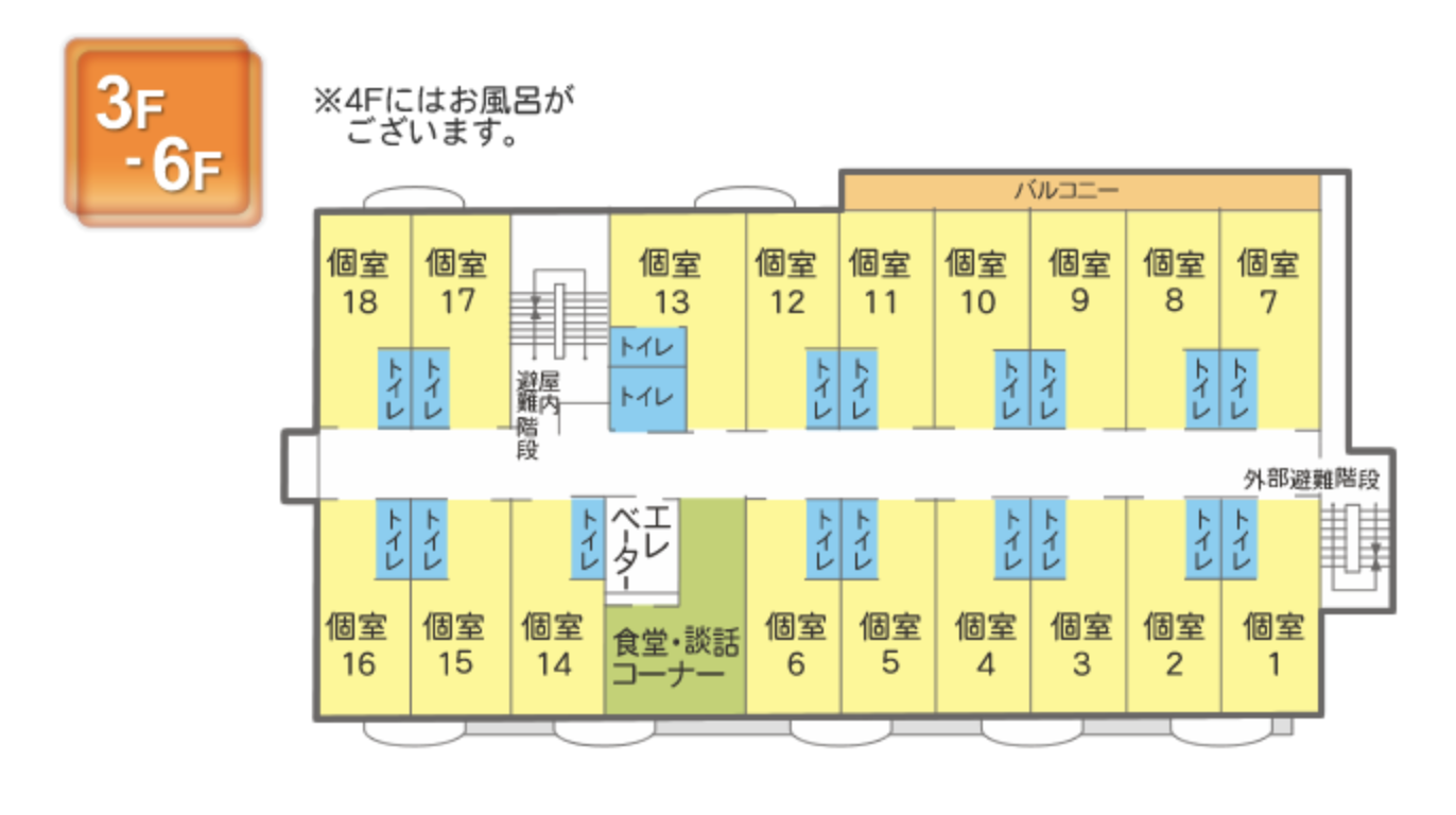 | 居室設備 | 洗面台、トイレ、電動ベッド、照明、エアコン |