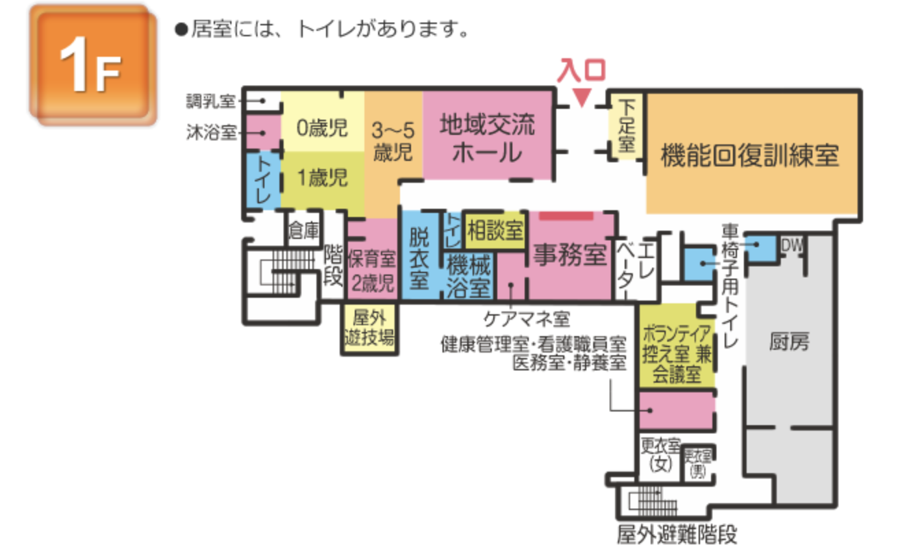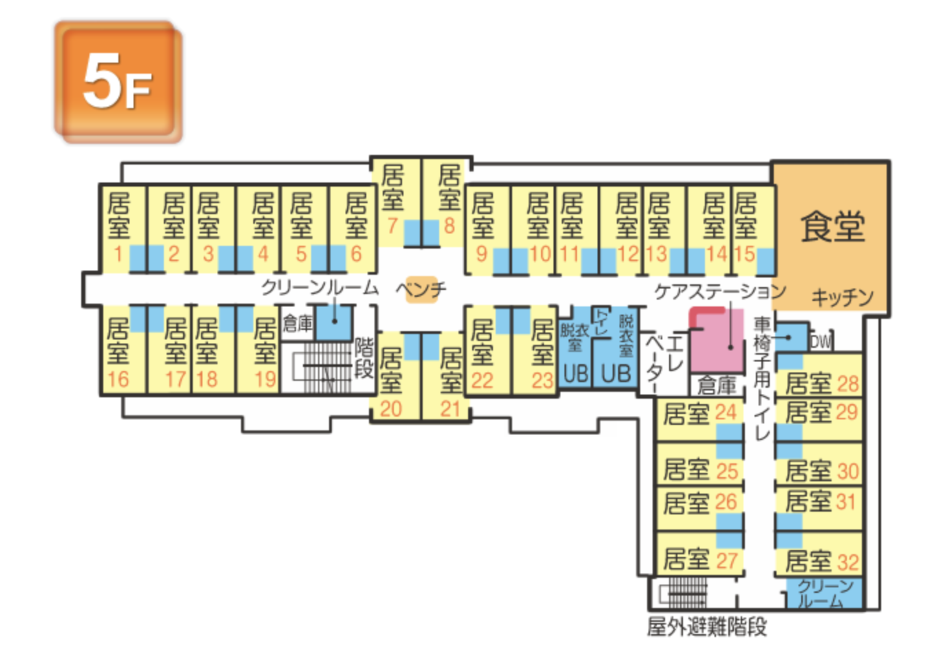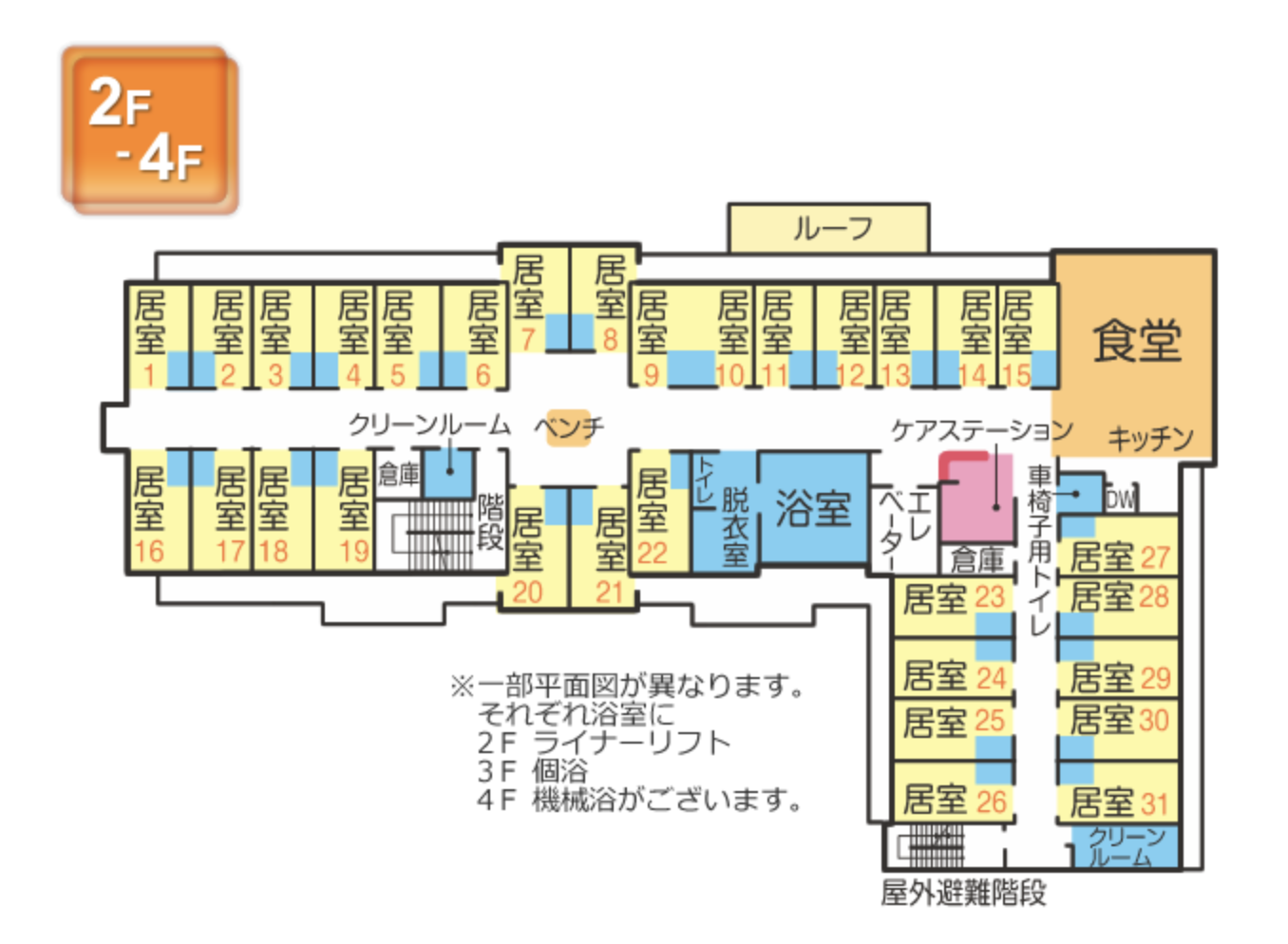 | 共用設備 | 食堂、浴室、また、お客様同士が、お話したり、行事をしたり、買い物サービス(出張コンビニ)が来たりする、フロアが1階にあります。 |