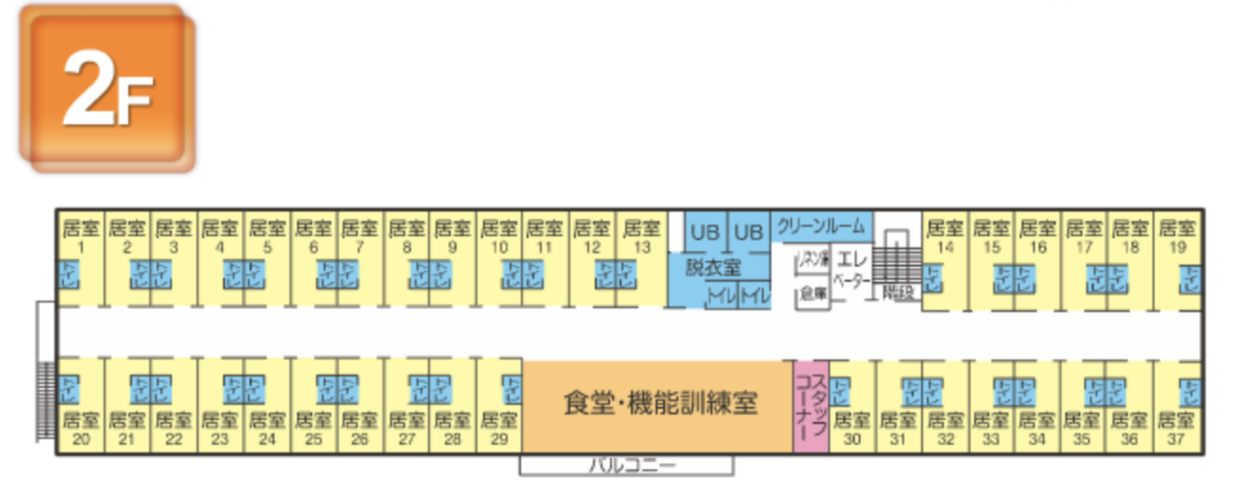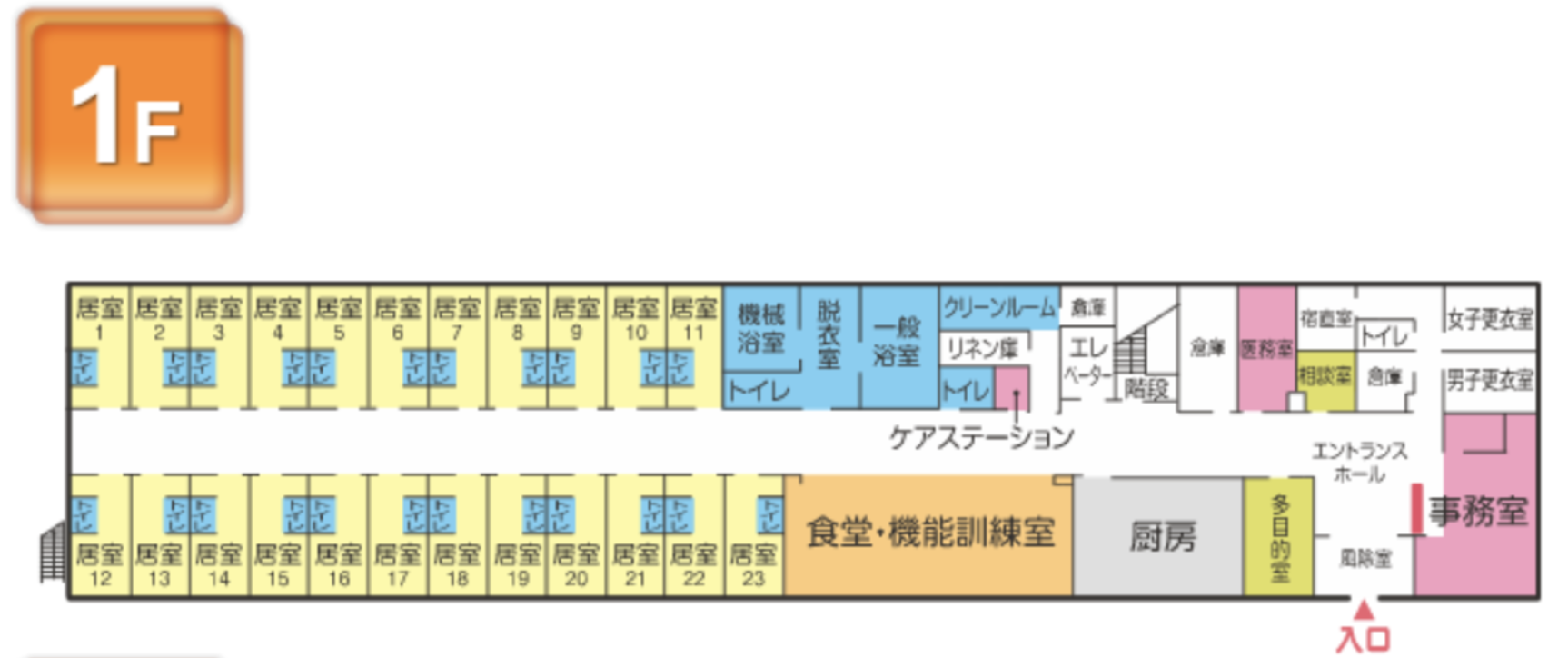 | 共用設備 | 共有洗面台 共有トイレ 脱衣室、一般浴槽、個人浴槽、機械浴槽 共有スペース(食堂) |