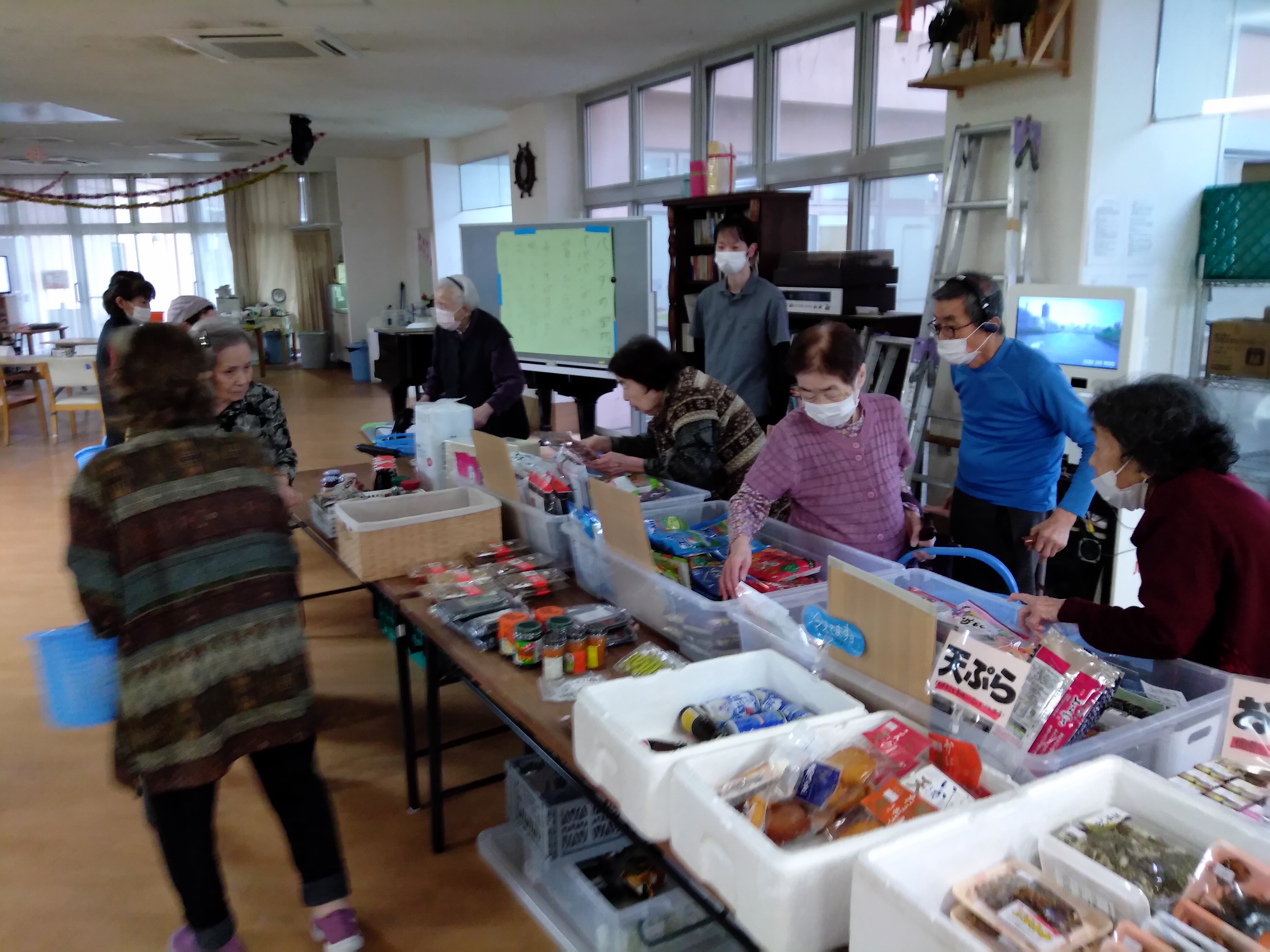 毎月第一・第三木曜日に外部の老人ホーム等に特化した訪問販売の業者様に来ていただいて、ご入居者様にお買い物を楽しんでいただいています。普通のスーパーでは変えない物や、フルーツ類等、果物ナイフが必要ないもの(バナナ・シャインマスカット・みかん等)等も販売しております。待ち遠しいご入居者様もいらっしゃいます。