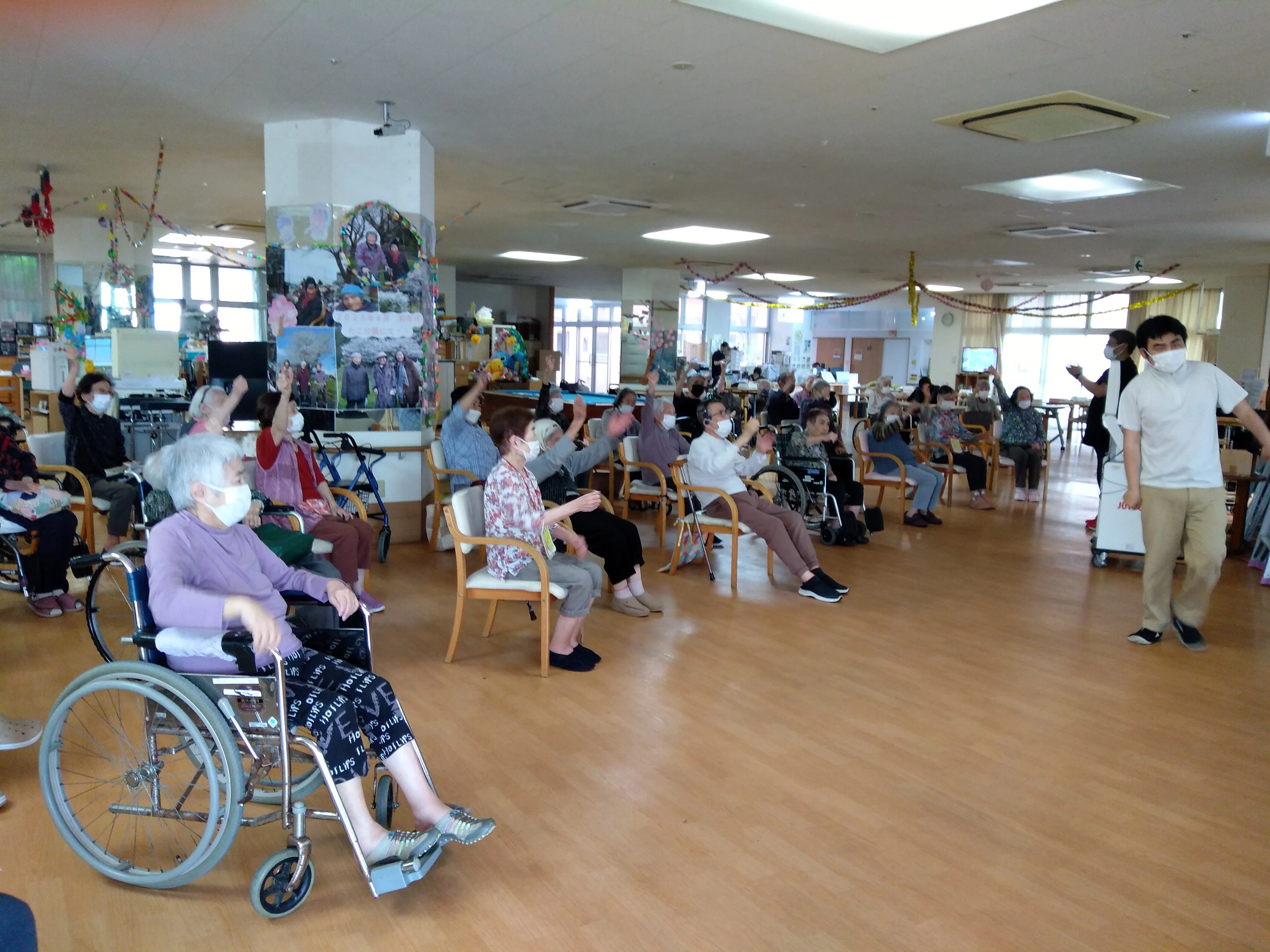 毎日、活力朝礼に多くの入居者様が参加頂いています。朝食後。8時30分より発声練習やリハビリ体操などをを通し元気に一日のスタートを切っています。 今年度より週別に今週の名言、今週の俳句を紹介し入居者様に毎日読みあげて頂いています。毎日、読み上げる事で職員もとても勉強になっています。体を動かすだけでなく、頭を使う事で元気に一日を過ごして頂いています。 これからも身体機能の維持を派らり、また精神面の安定を図れるように取り組んでいきます。