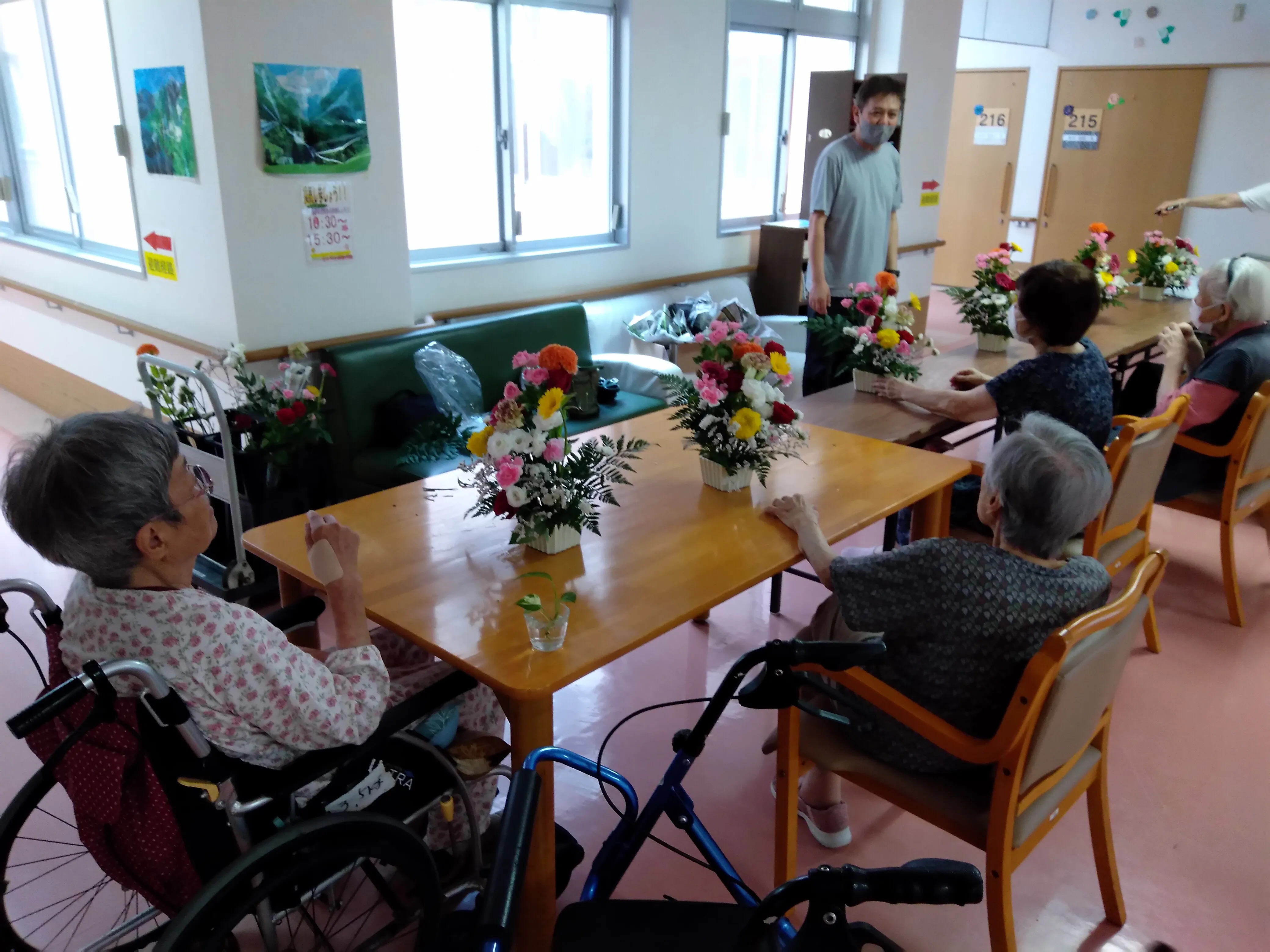 毎月第一木曜日の15:30から外部の方のフラワーアレンジメント教室を行っています。 毎回たくさんの季節のお花をご用意いただき、とてもボリュームのあるアレンジメントが出来上がります。細かく先生がご指導されるので、失敗することなく皆様綺麗に飾られています。 毎回出来上がりがとても楽しみです。