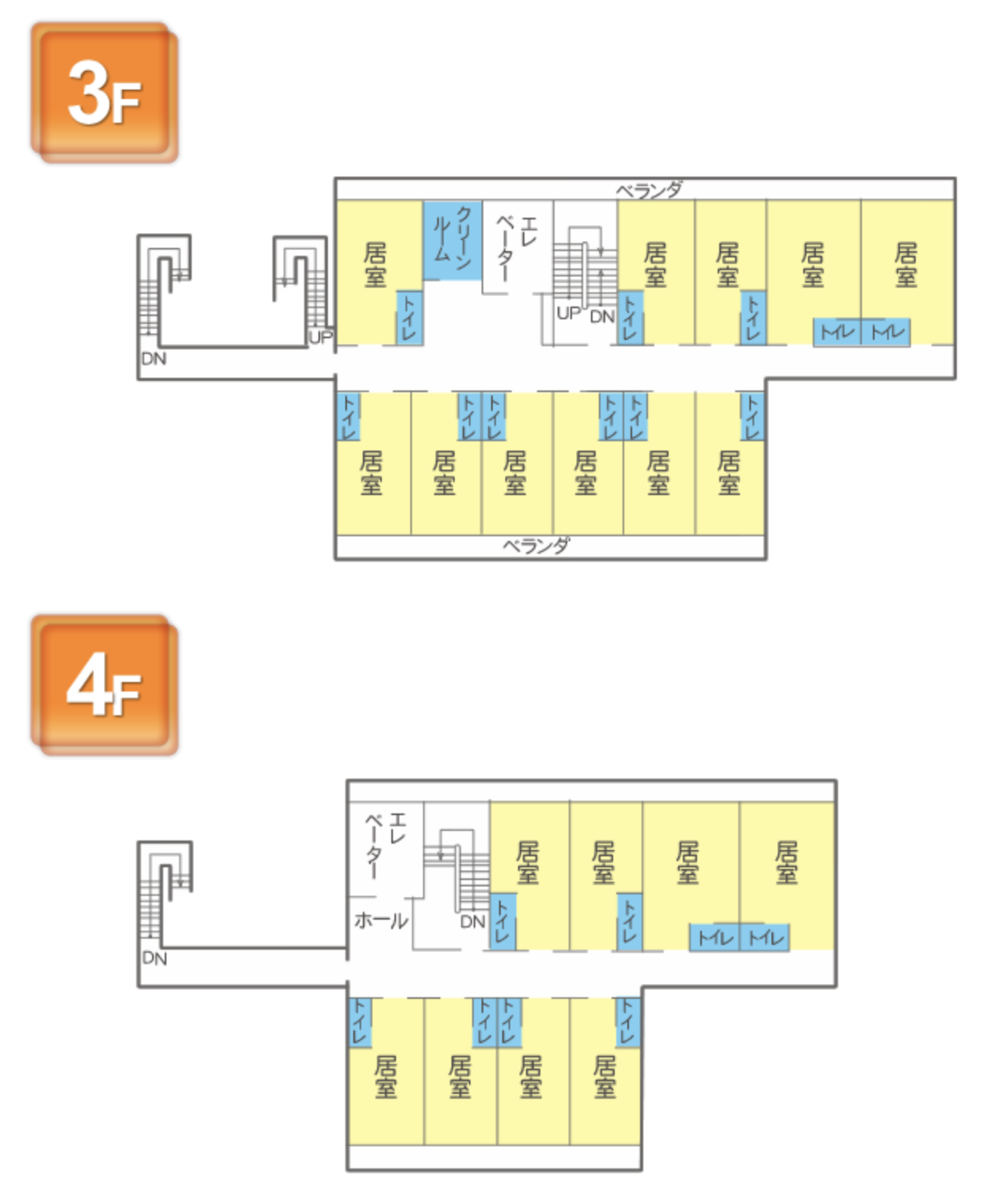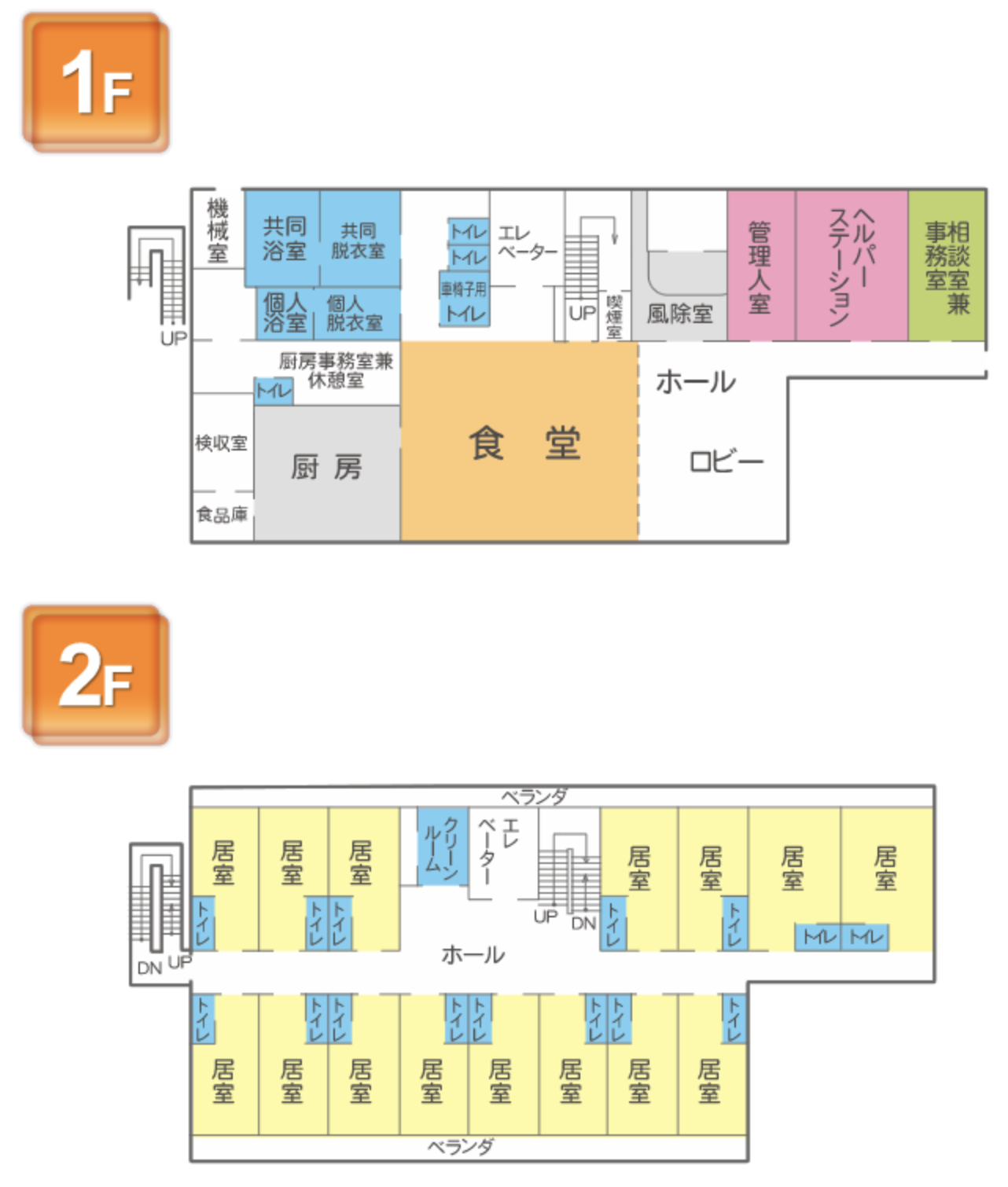 | 共用設備 | ロビー、エレベーター、一般浴室、個人用浴室、健康管理・相談室、共用トイレ、厨房室、車椅子用トイレ、食品庫、ダイニングルーム(食堂) |