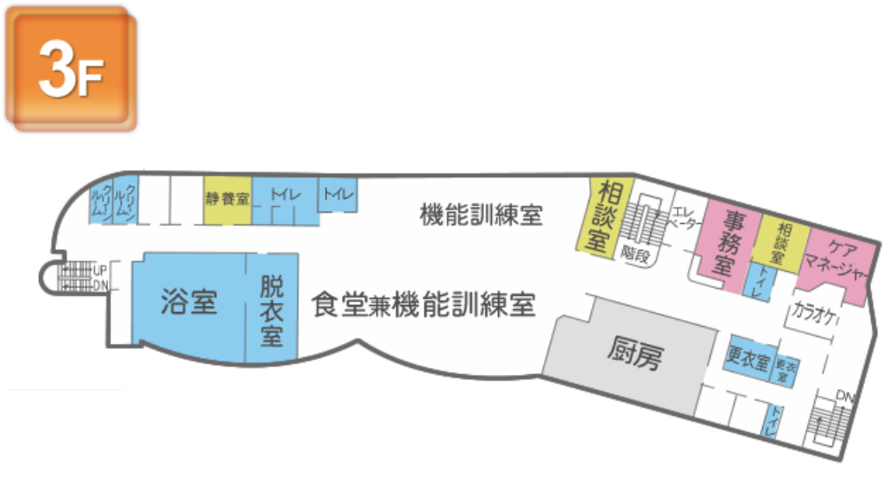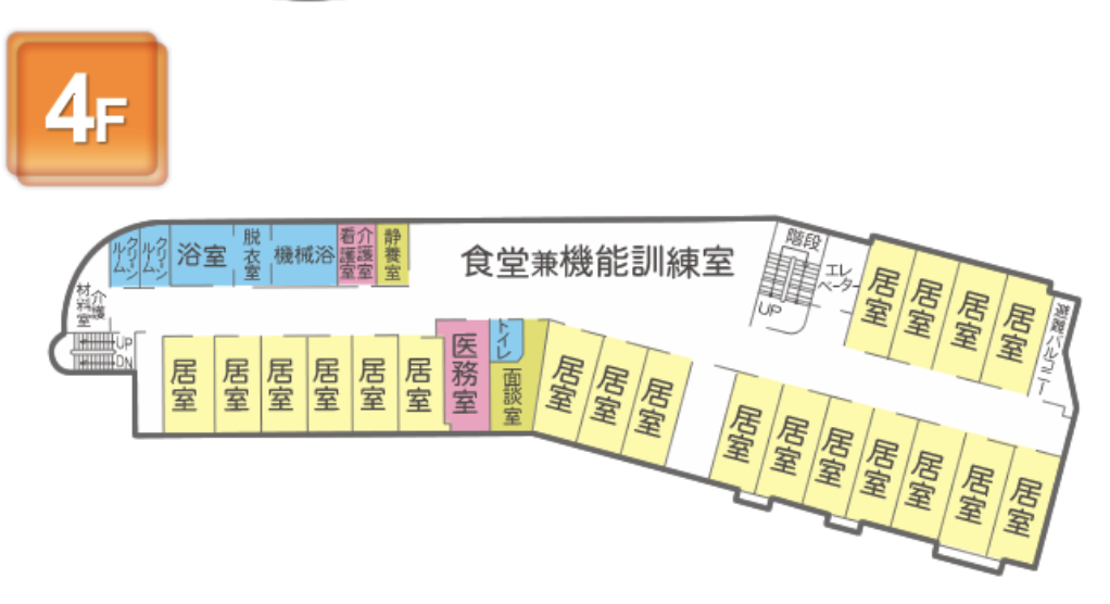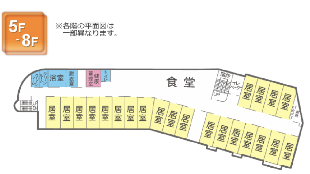 | 共用設備 | エレベーター、カラオケルーム、一般浴室、ケアマネージャー事業所、健康管理・相談室、医務室、厨房室、更衣室、機械浴室、静養室、食道兼機能訓練室 |