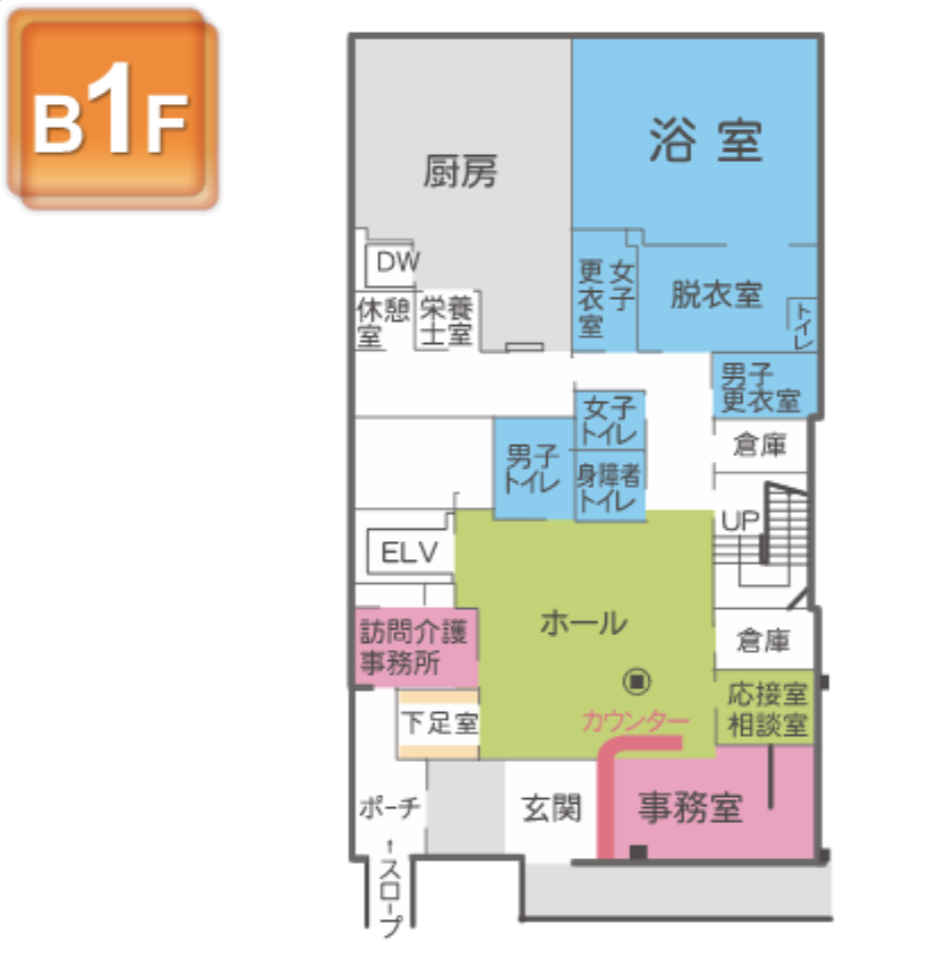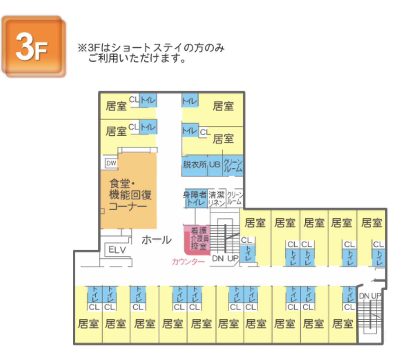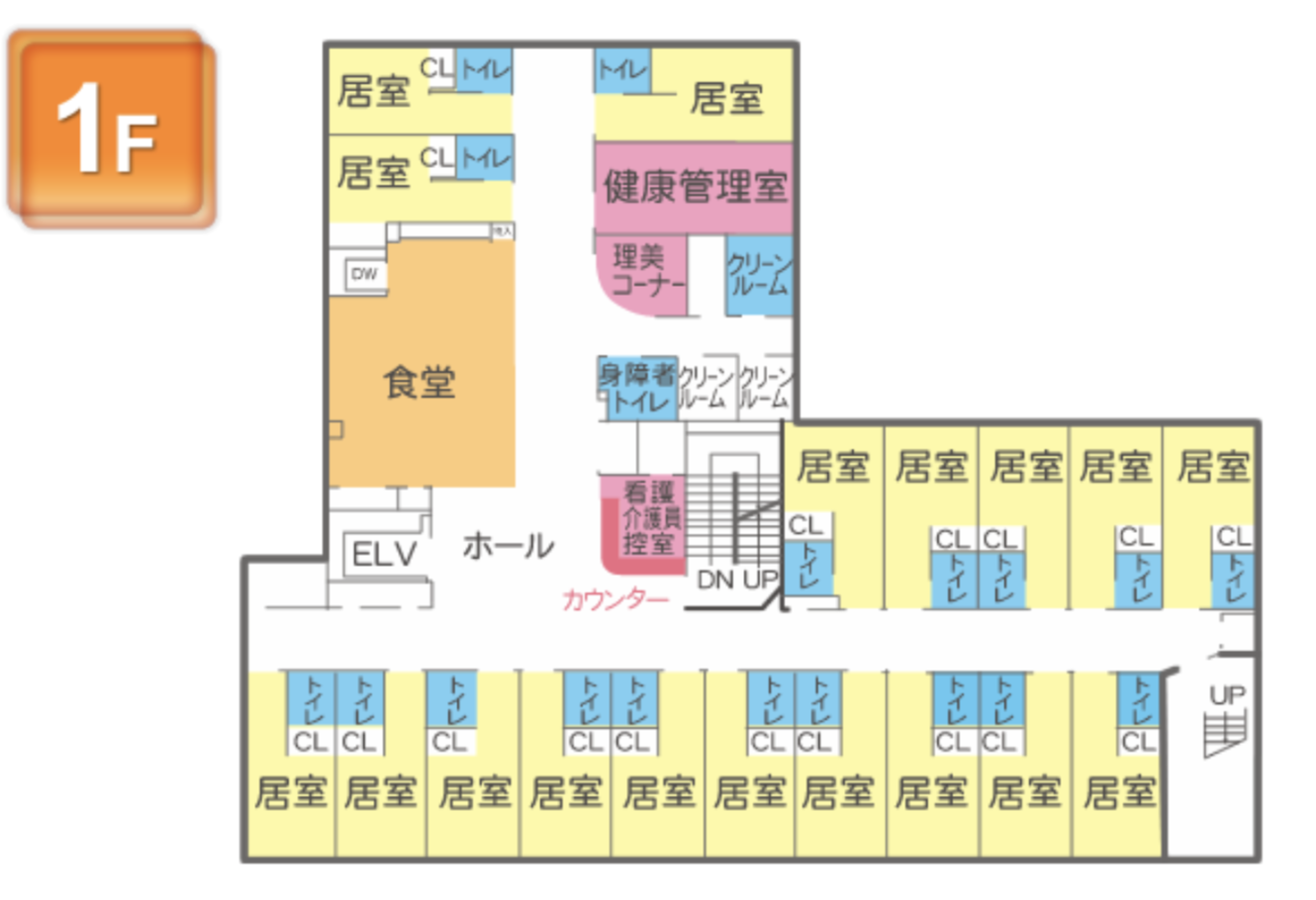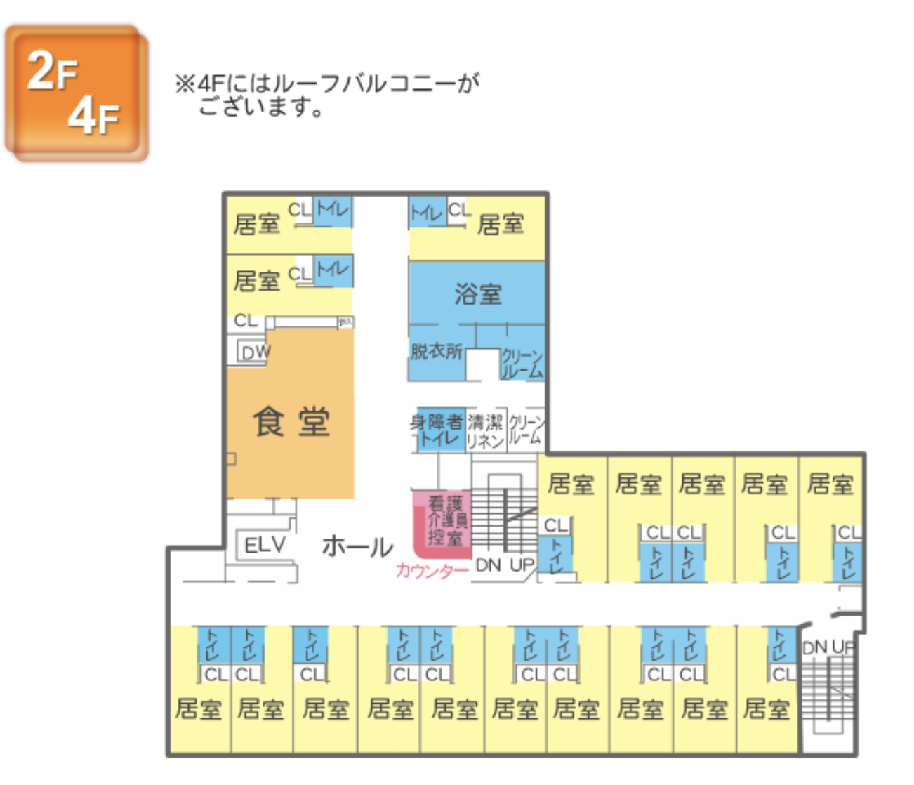 | 共用設備 | エレベーター、一般浴室、健康管理・相談室、共用トイレ、厨房室、リネン室、応接室、更衣室、理美容室、車椅子用トイレ |