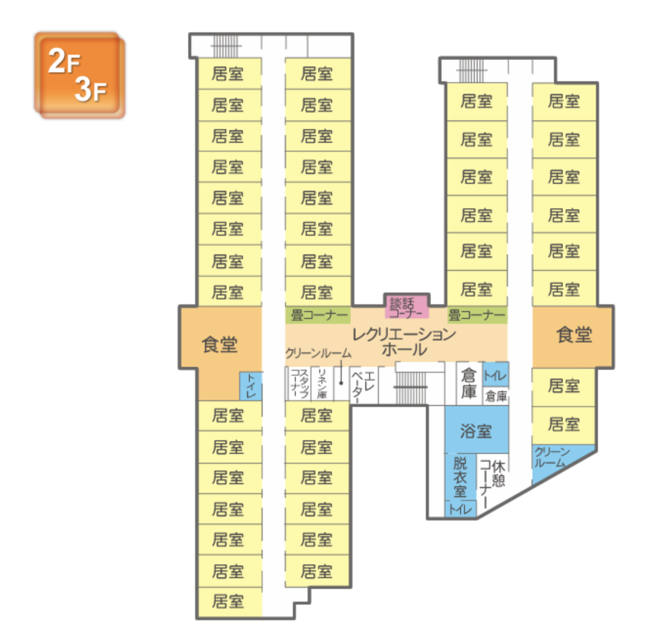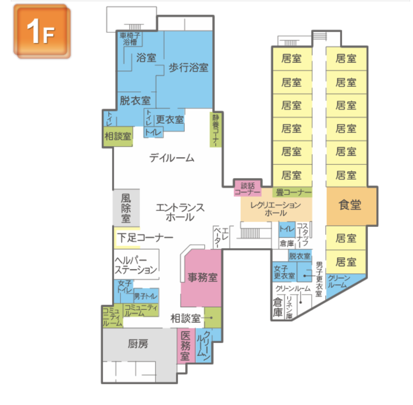 | 共用設備 | 一般浴室、健康管理・相談室、共用トイレ、医務室、厨房室、更衣室、機械浴室、談話室、ダイニングルーム(食堂) |