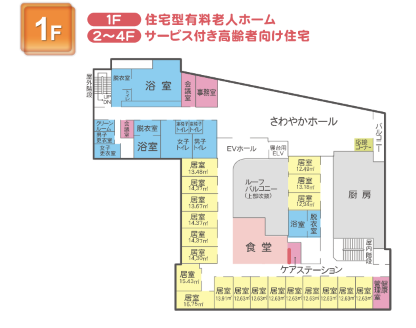 | 共用設備 | 一般浴室、健康管理・相談室、共用トイレ、厨房室、寝台用エレベーター、更衣室、機械浴室、理美容室、ダイニングルーム(食堂) |