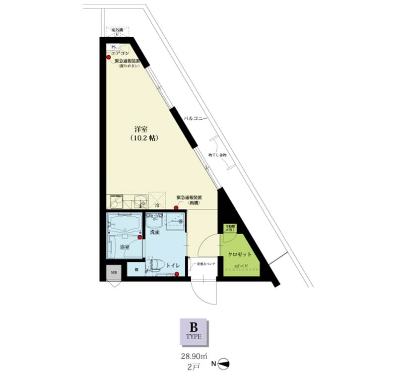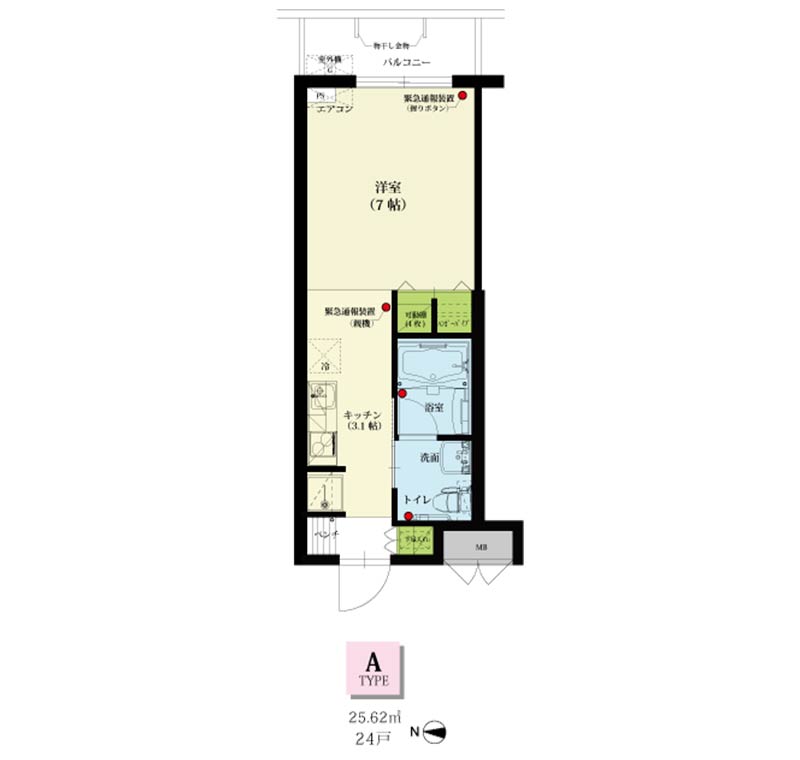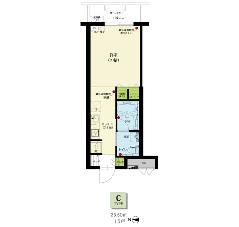 | 居室設備 | 玄関、玄関(ベンチ、折りたたみ椅子)、システムキッチン、浴室、洗面所、トイレ、緊急通報設備、収納(クローゼット・物入)、エアコン |