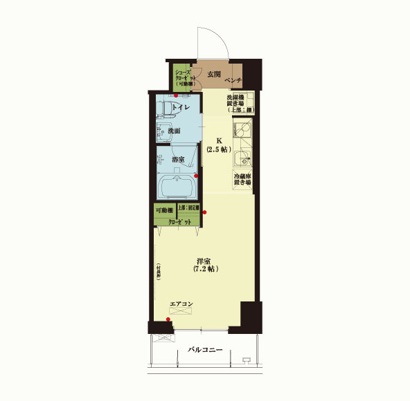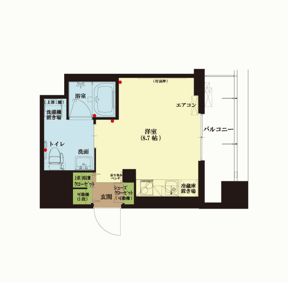 | 居室設備 | 玄関、玄関(ベンチ、折りたたみ椅子)、システムキッチン、浴室、洗面所、トイレ、緊急通報設備、収納(クローゼット・物入れ)、エアコン |