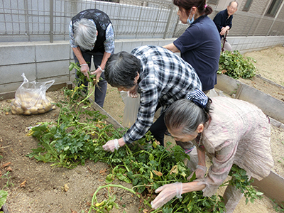 - 施設の南側には、ほど良い広さの中庭があり、皆で丹精込めて育てた季節の野菜は、収穫を楽しんだり、食卓を彩っています。 時には、畑の横に設置しているベンチに座って、綺麗に咲かせた草花達を眺めながらゆったりとした時間を自由に楽しんでいただいています。