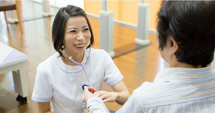 看護と介護の専門スタッフが、24時間お客さまを見守ります。看護師による日々の健康管理や健康相談など、常に健康状態をチェックし、体調の変化に気を配っています。持病のある方にも安心な環境です。また、夜間も巡回を行い、緊急時の対応に備えています。