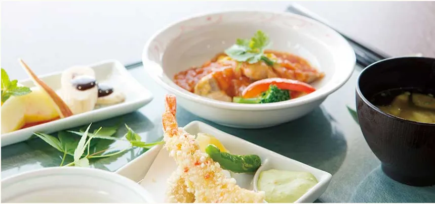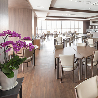 毎日のお食事をお楽しみいただけるよう、ホテルや料亭などで経験を積んだ専属の料理人が、四季折々の食材を用いてご提供しております。管理栄養士による献立をもとに、おいしさと栄養バランスを考慮したお食事は、ご入居者さまの身体を作る基礎として大切な要素と考えております。