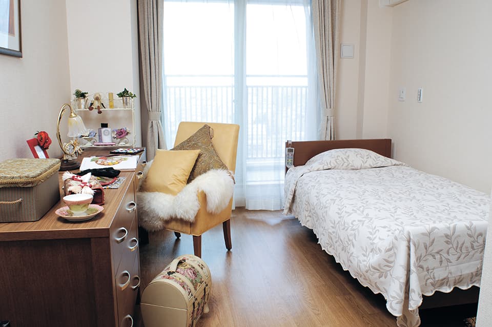 | 居室設備 | メモリーBOX、介護ベッド、緊急呼び出しボタン、トイレ、クローゼット、洗面化粧台、エアコン、照明、デスク、チェア、カーテン、ユニットバス、ミニキッチン ※ユニットバス、ミニキッチンはお二人様タイプのみ |