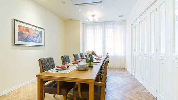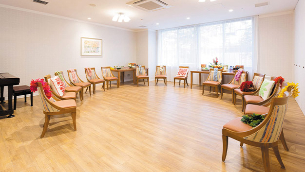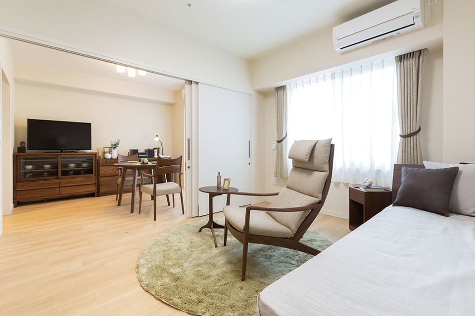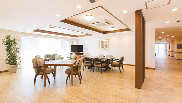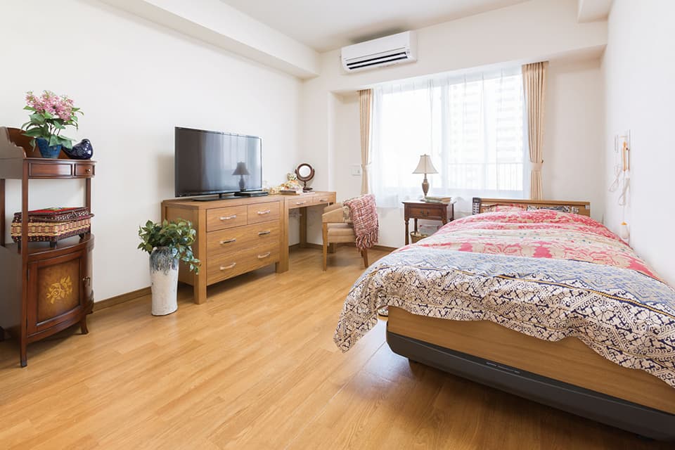 | 居室設備 | 介護フロア部分:緊急呼び出しボタン、トイレ、クローゼット、昇降式洗面カウンター、エアコン、照明、デスク、チェア、カーテン 自立フロア部分:トイレ、三面鏡付洗面化粧台、キッチン、ユニットバス、クローゼット、エアコン、緊急呼び出しボタン、生活サイクルセンサー、カメラ付インターホン |